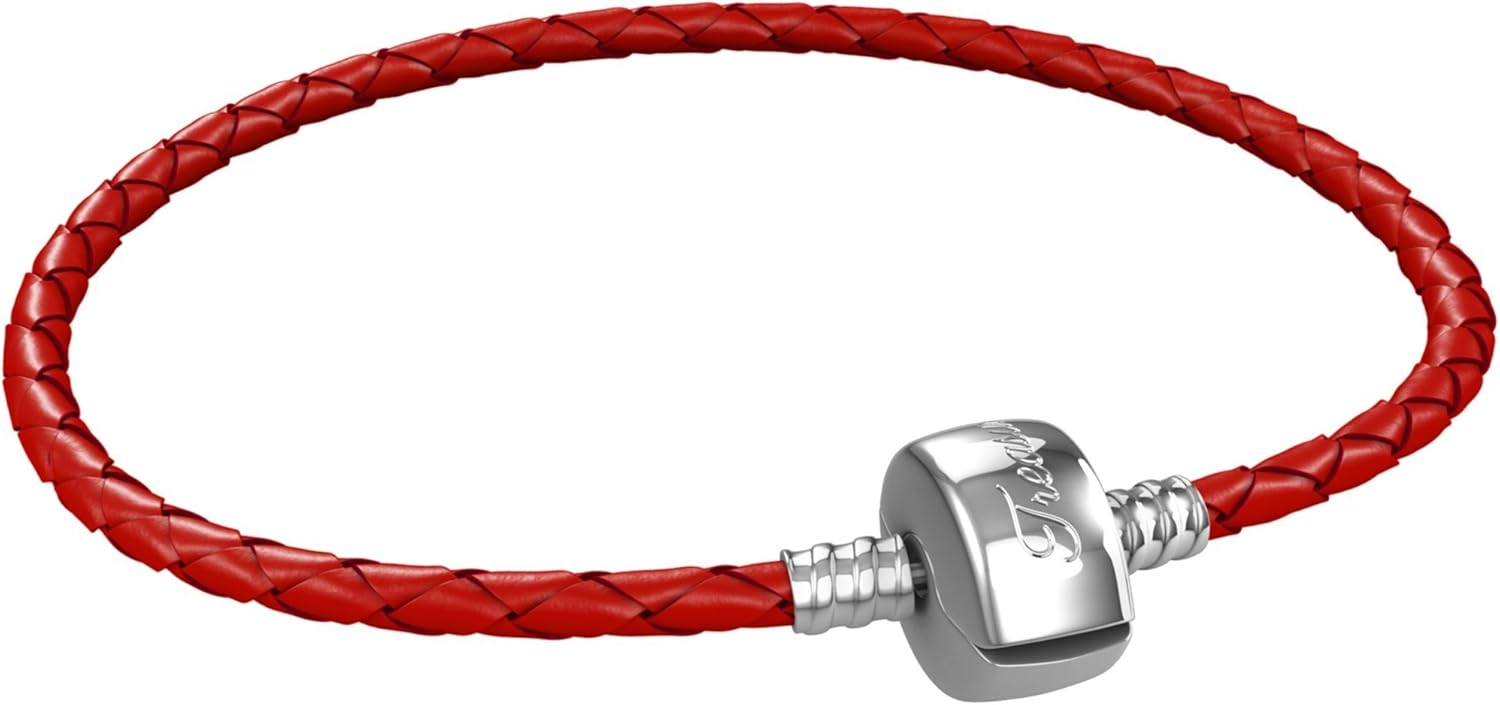 Braided Leather Charm Bracelet for Women, Fits European Charms, Barrel Snap Clasp, Red 7.5 Inch
