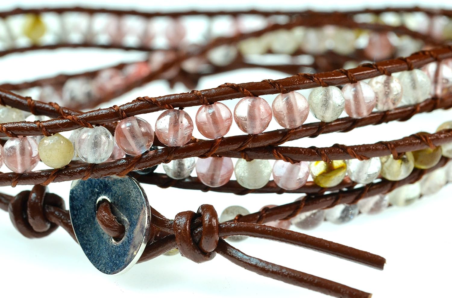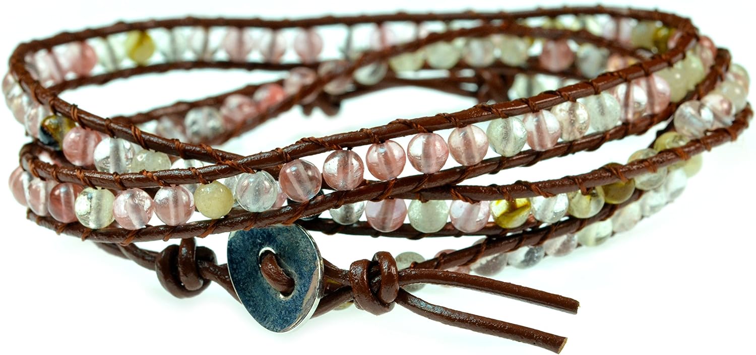 Luos 26" Pink Clear Simulated Quartz Gemstone on Geniune Brown Leater Wrap Bracelet