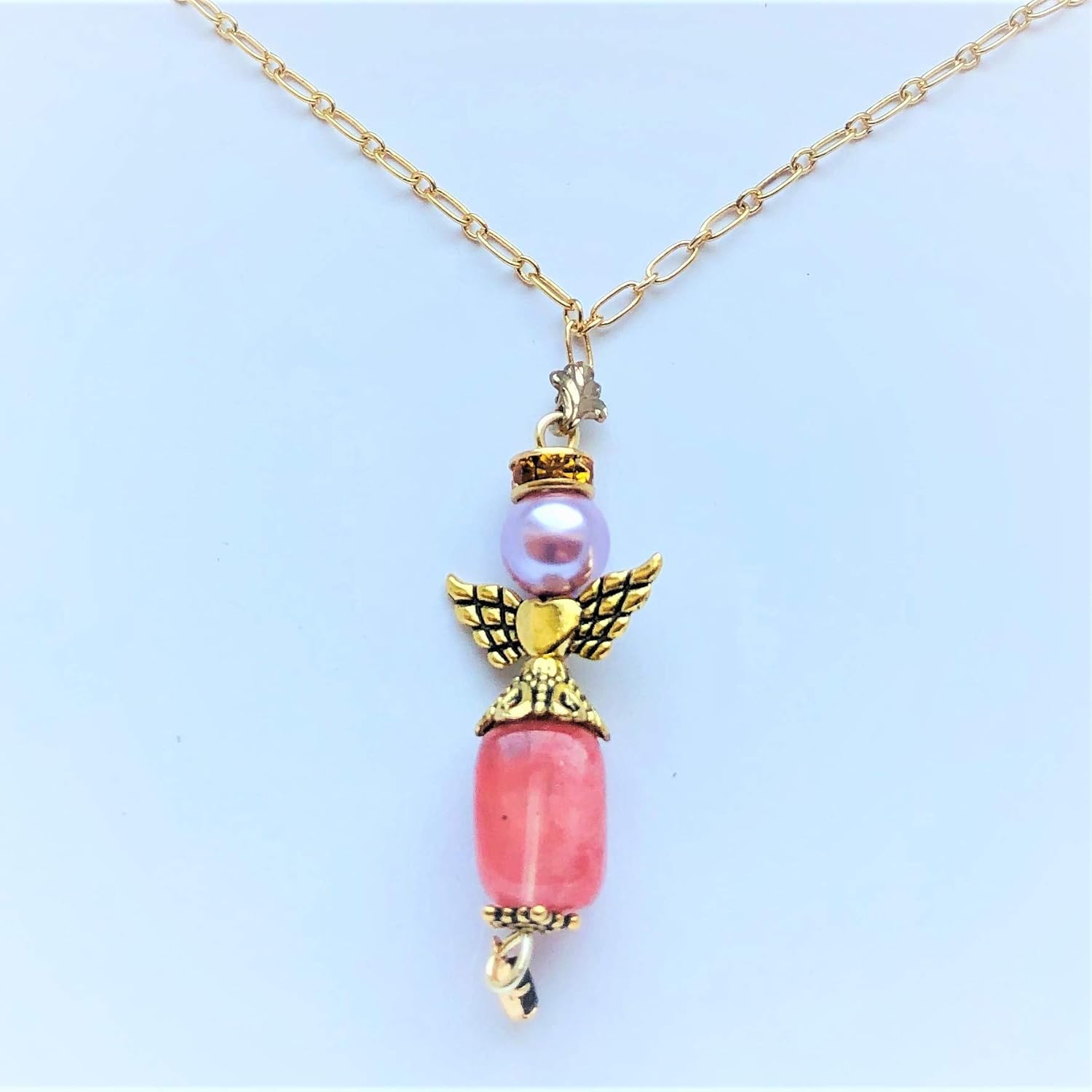 Guardian Angel Watching over you Pendant Golden Wings Large Agate Rhinestone Necklace
