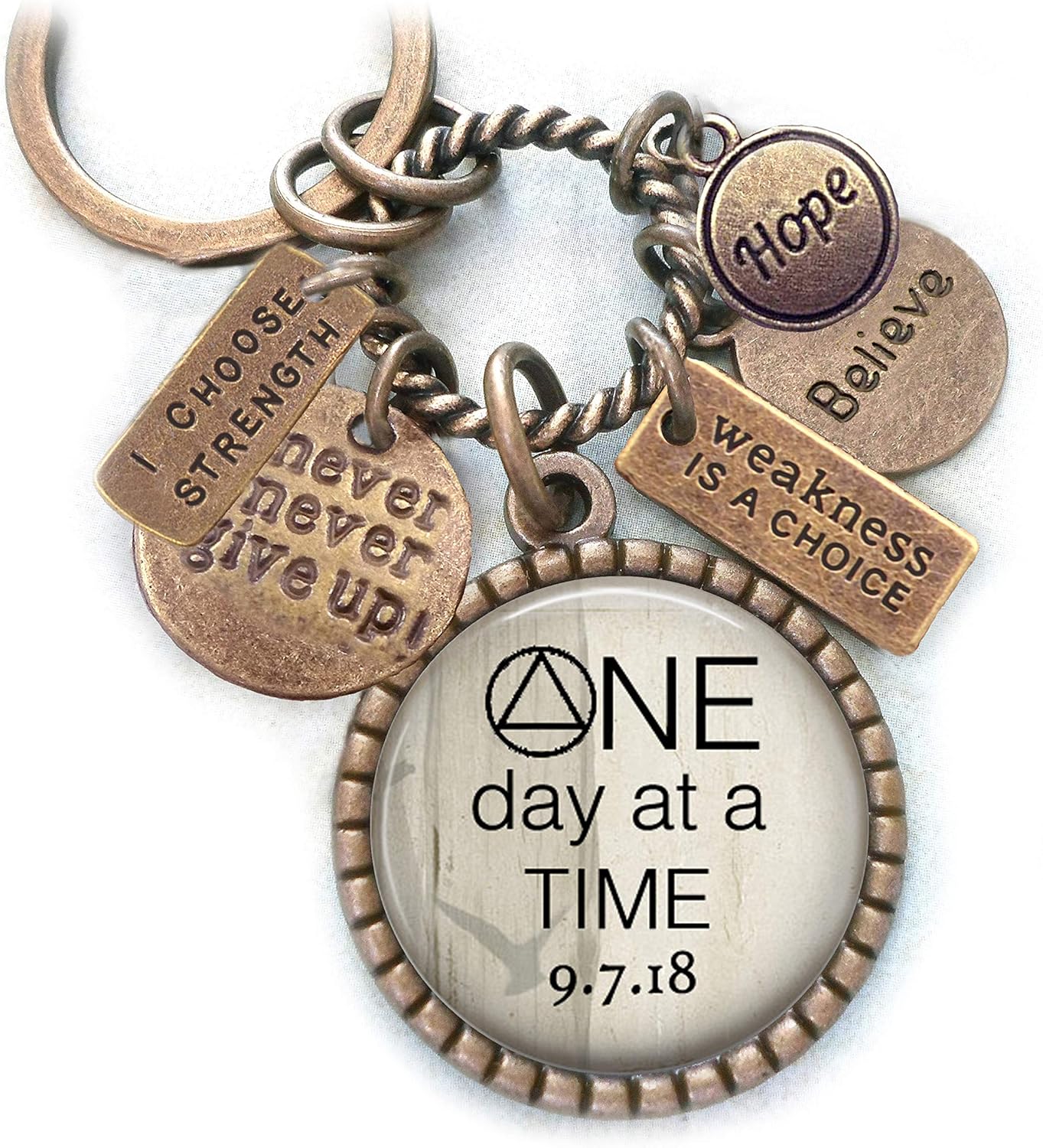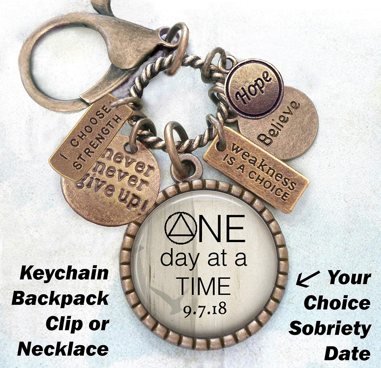 One Day At A Time Sobriety Backpack Clip, Key Chain or Necklace, Sobriety Anniversary Gift, Recovery Gift, AA, Alcoholics Anonymous, I Choose Strength, Custom Date
