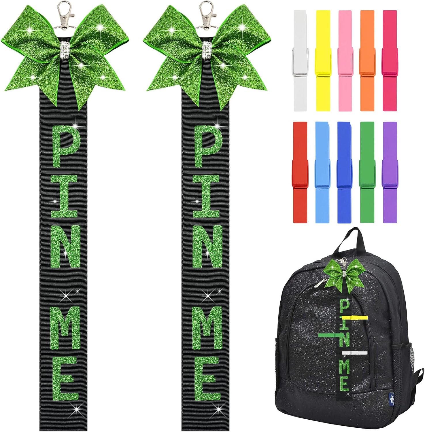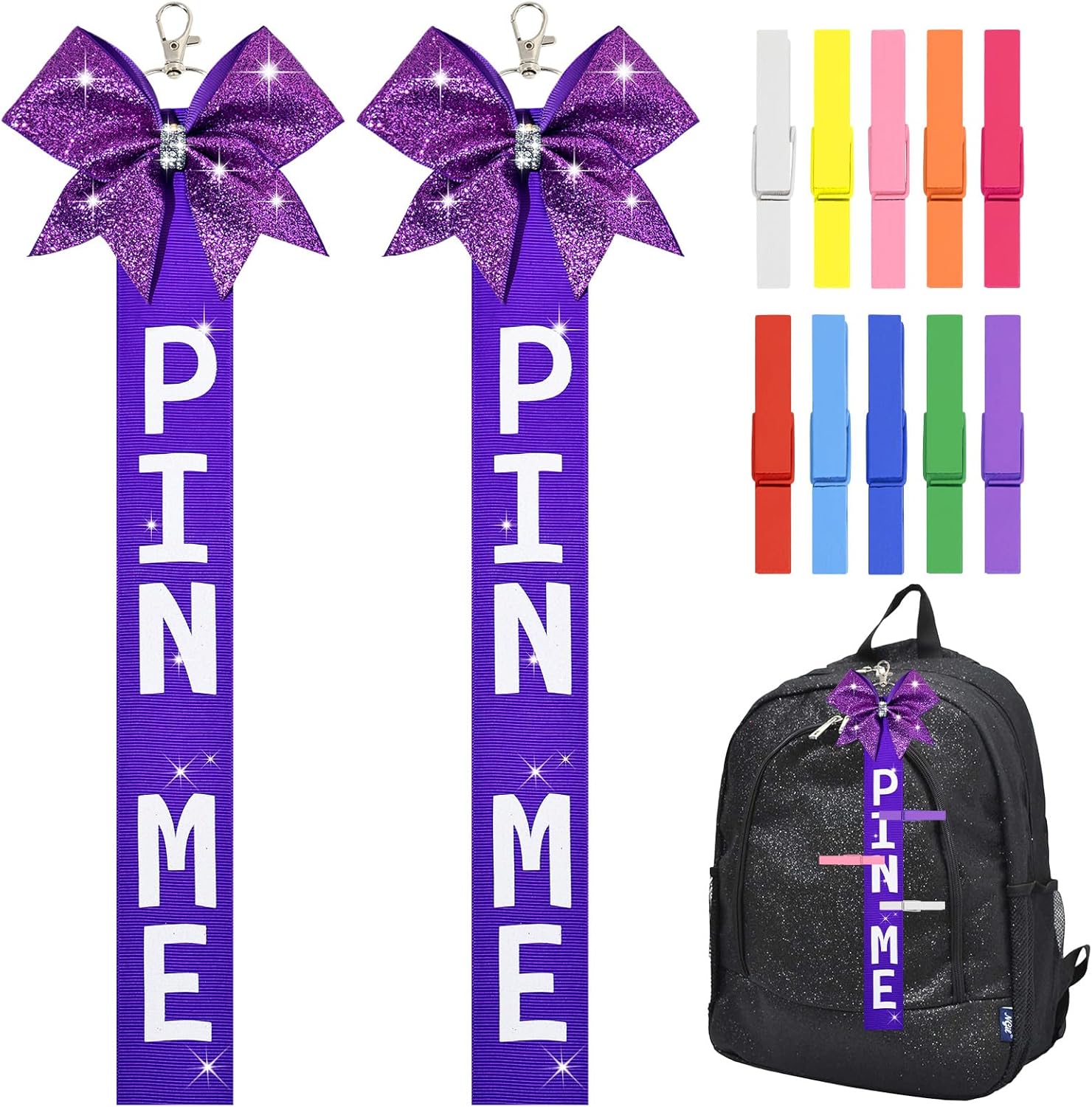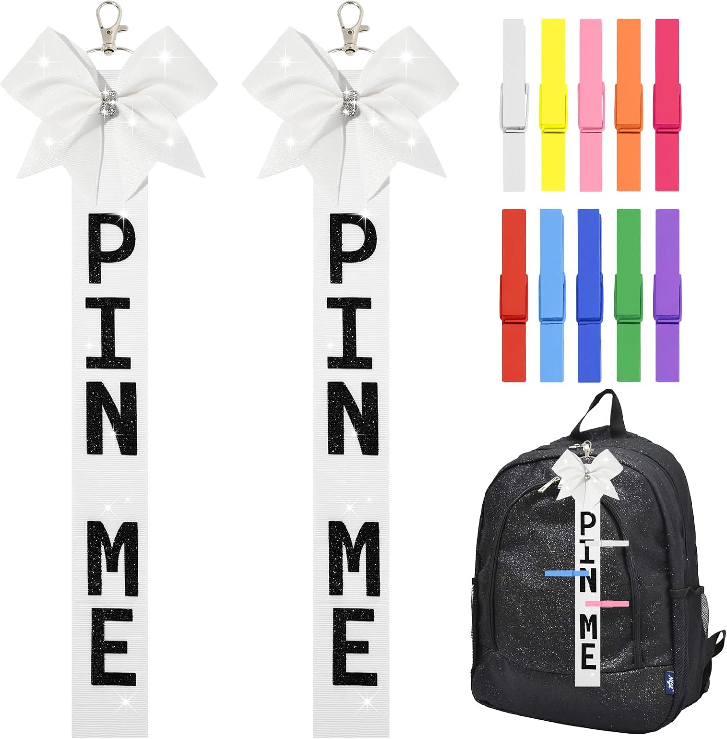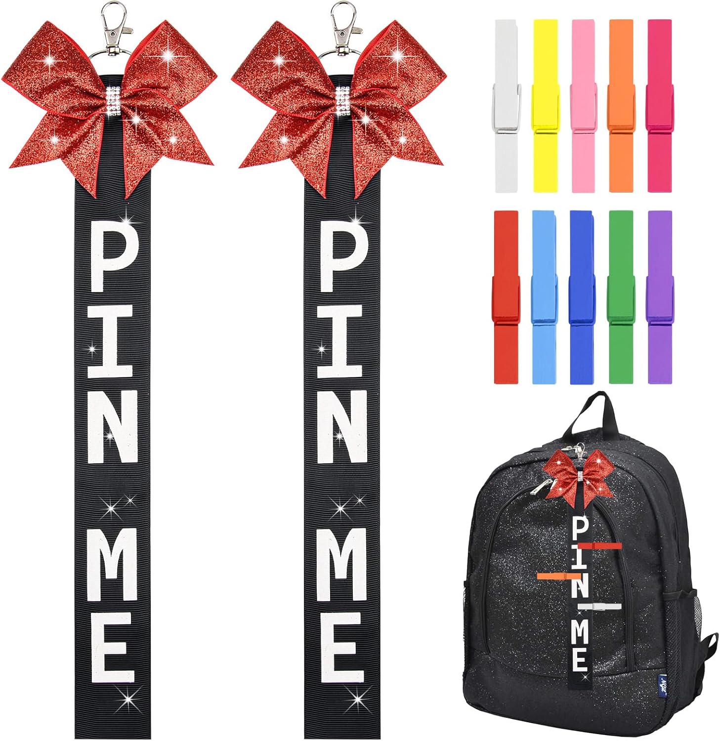 Cheer PIN ME Strap – Show Your Spirit: Elevate your cheerleading game with our vibrant set of 2 Pin Me Ribbons and 10 Cheer Pins. Each 14-inch keychain is perfect for showcasing your cheer spirit, featuring glittery letters, ribbons, and rhinestone bows—ideal for attaching to your backpack or gear for all to see.