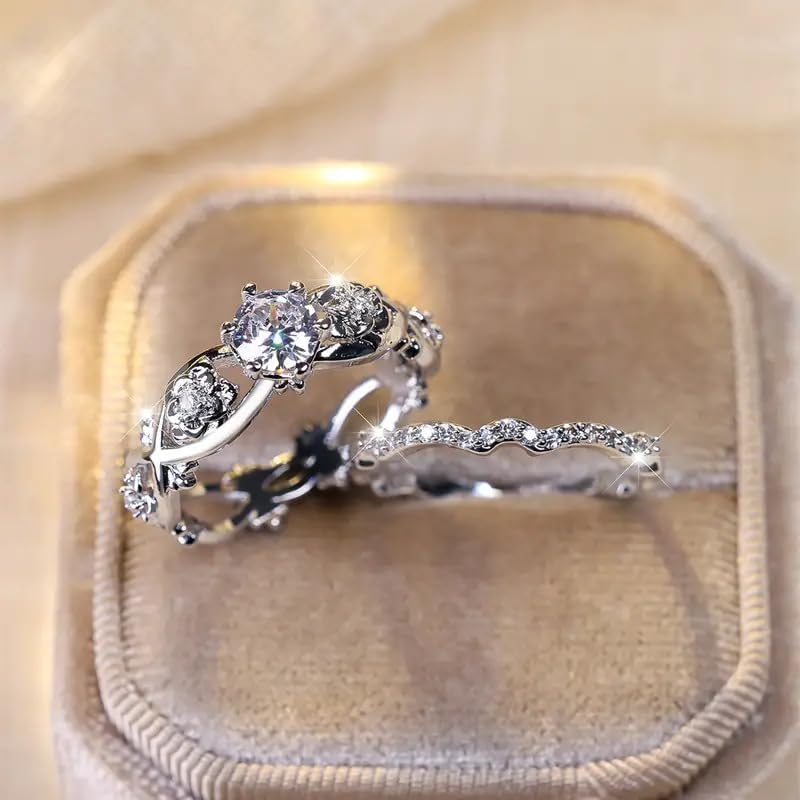 2 Pcs Rose Flower Ring Set for Women, Elegant Silver Tone Stacking Rings, Fashionable Dainty Luxury Band Set(Silver,7)