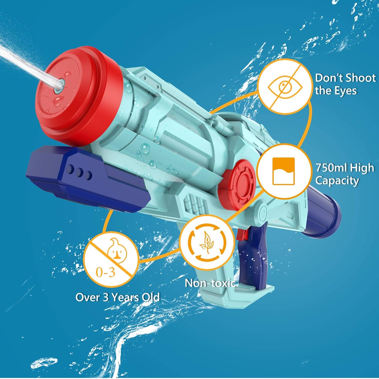 Cool Design - Safe Material: Bright blue color, durable and non-toxic ABS material, no small parts or any sharp edges, this water pistol is great for family fun, swimming pool, party and outdoor activities, water sprays by pulling the trigger after sliding the pump back and forth. Good gift choice for the coming summer!