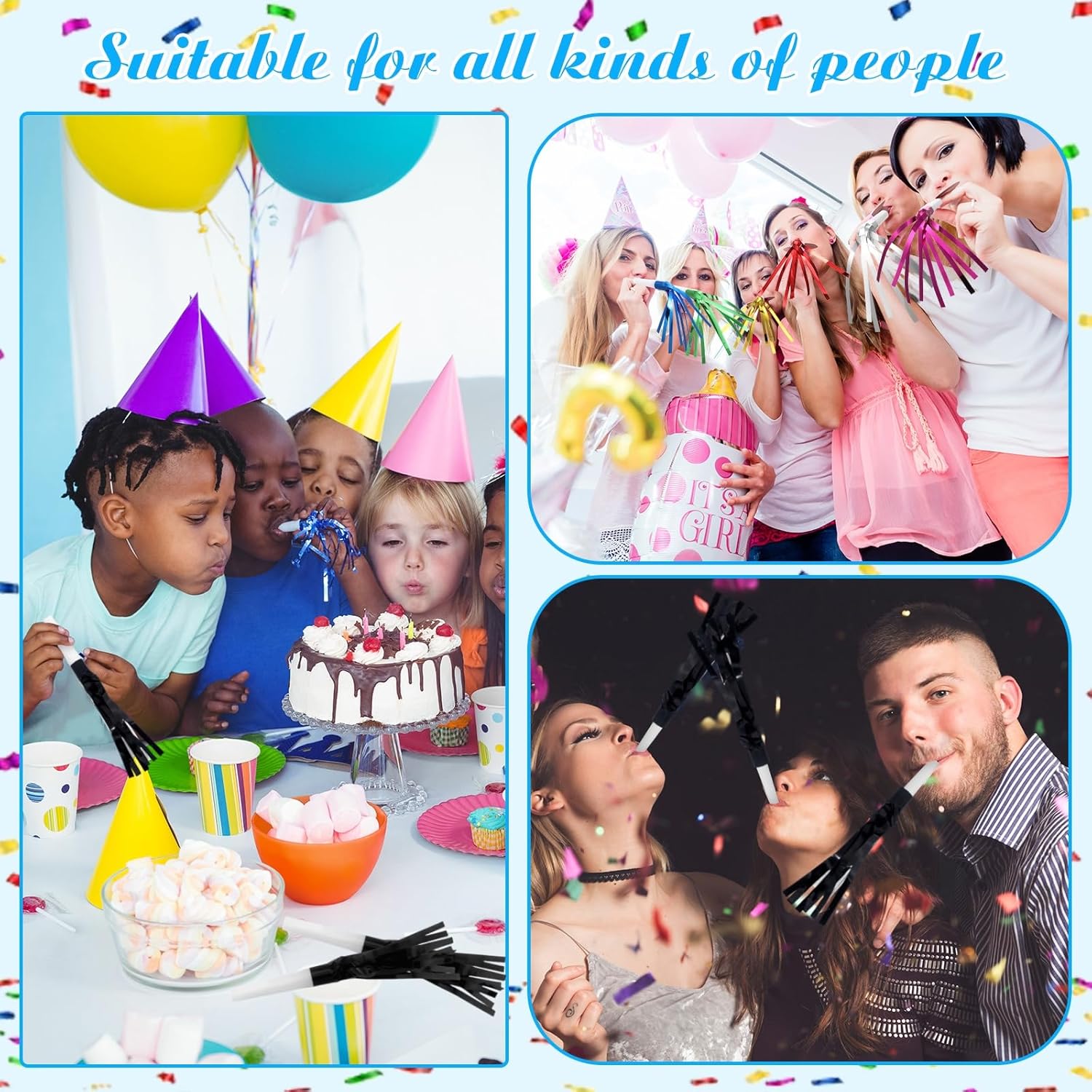 24 Pcs Gold Noise Makers Glitter Metallic Fringed Noise Makers Horns for Baby Shower, Kids Birthday, Wedding Party, New Year Party Favor(Black)