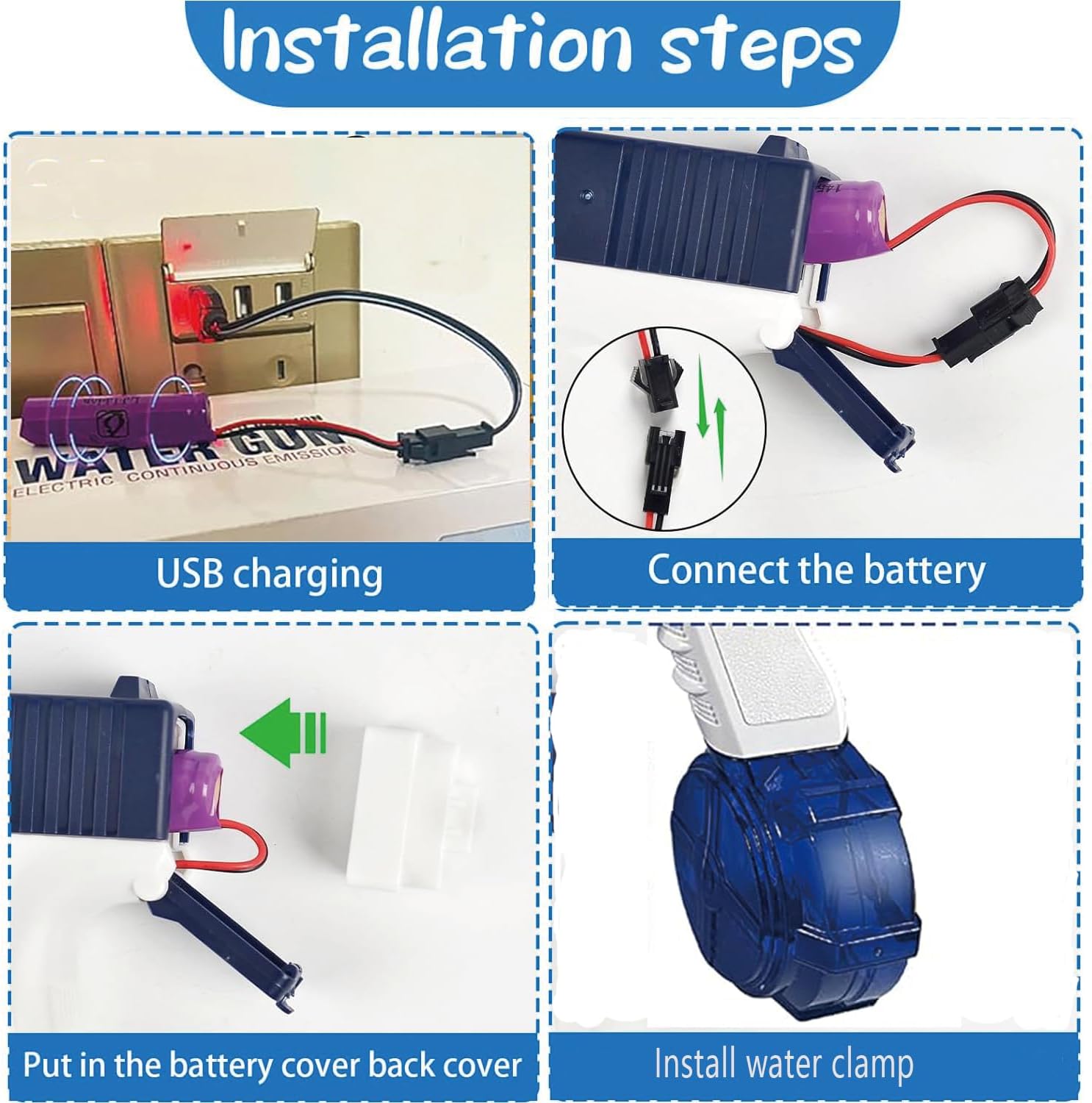 【BATTERY POWERED WATER GUN】- The electric water gun's battery supports USB charging for continuous use. 50 min long battery life gives you unlimited summer fun! Includes two high-capacity 3.7V batteries (single battery lasts 25min) and 2 USB charger. Single battery charging time is 110 min.
