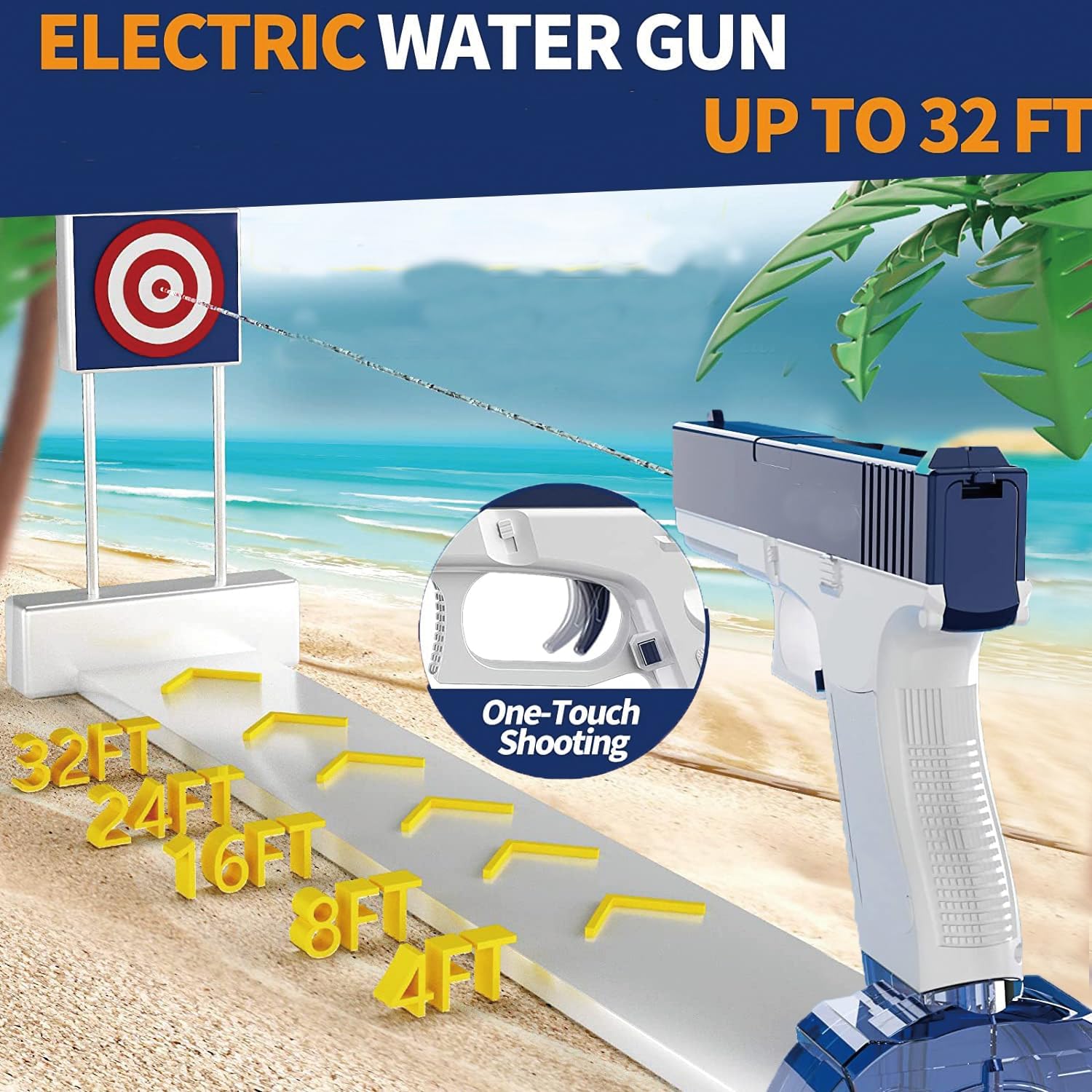 【COOL AND FUN】- No more manual pressurization hassles for you with this electric water gun's one-touch firing! Every pull of the trigger discharges a powerful individual blast of water with unprecedented precision. The water gun has a super long range of 26-32 ft. In this exciting season, have an exciting water gun battle with your friends or kids!