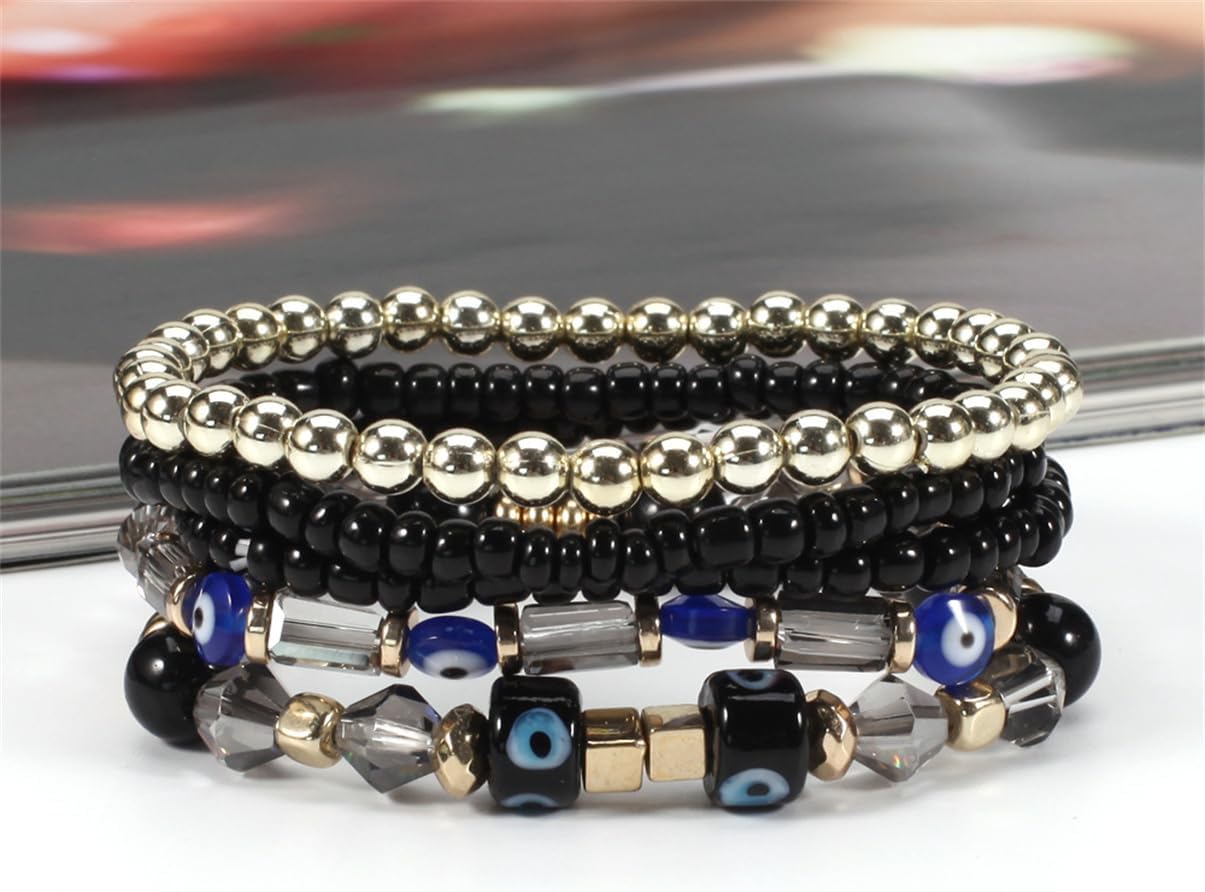 5Pcs Bohemian Stackable Beaded Bracelets Set for Women,Multilayer Evil Eye Bracelets,Boho Layered Strand Bead Bracelets, Handmade Crystal Lucky Protection Stretch Bracelets for Women(Black)