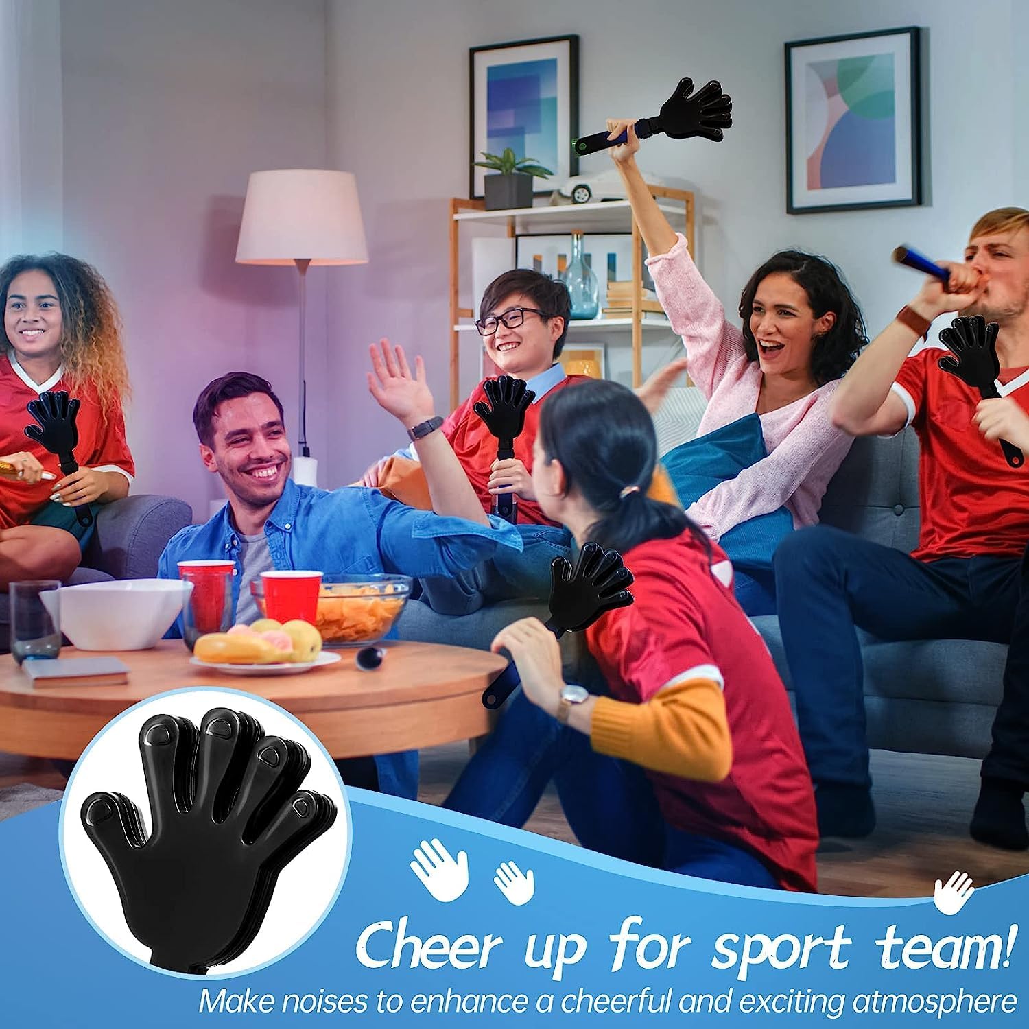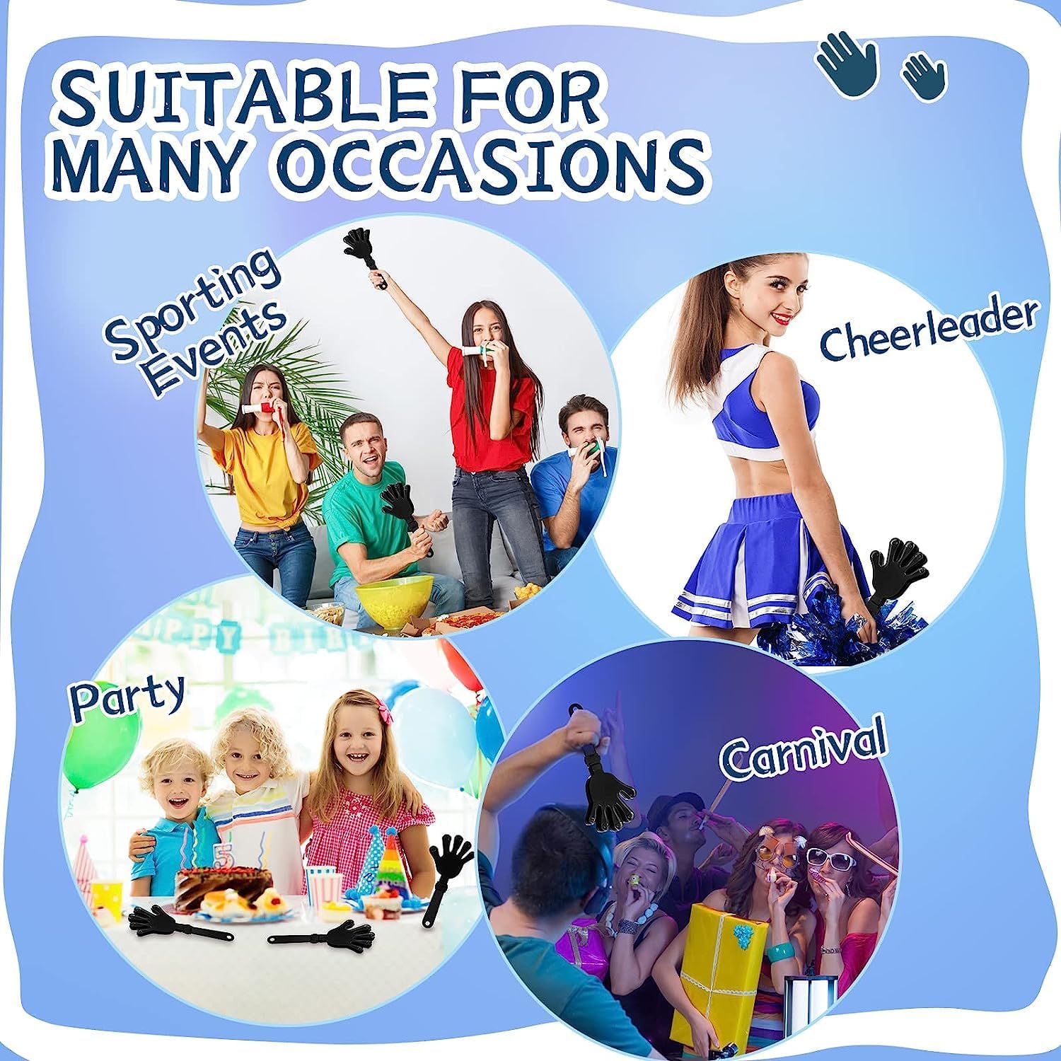 Add convivial atmosphere: Happy atmosphere is always noisy, the top of hand clapper noisemaker is composed of 3 flexible and lifelike small hands, our clappers for kids can add fun atmosphere, you can use these plastic hand clappers to cheer up game parties and cheerleaders, infect the audience