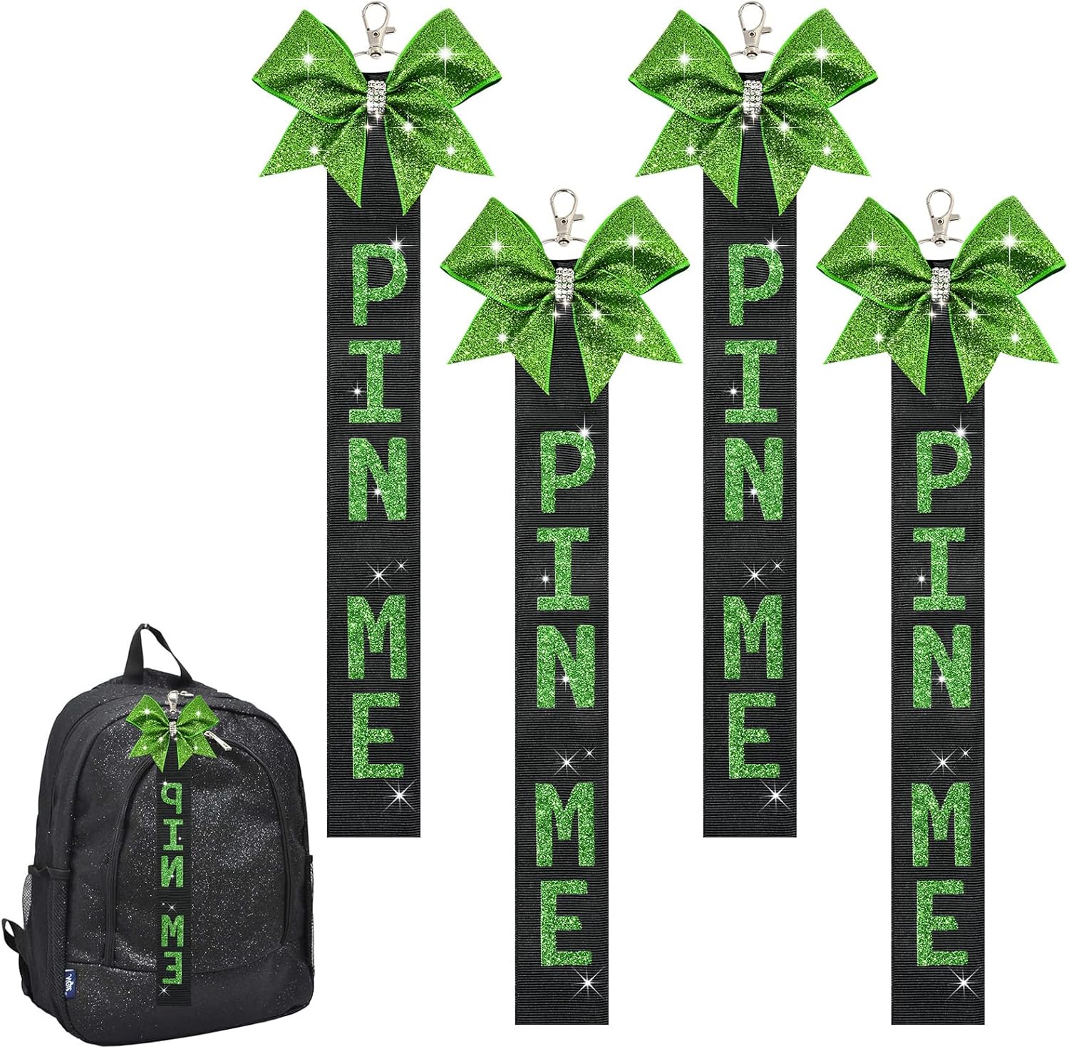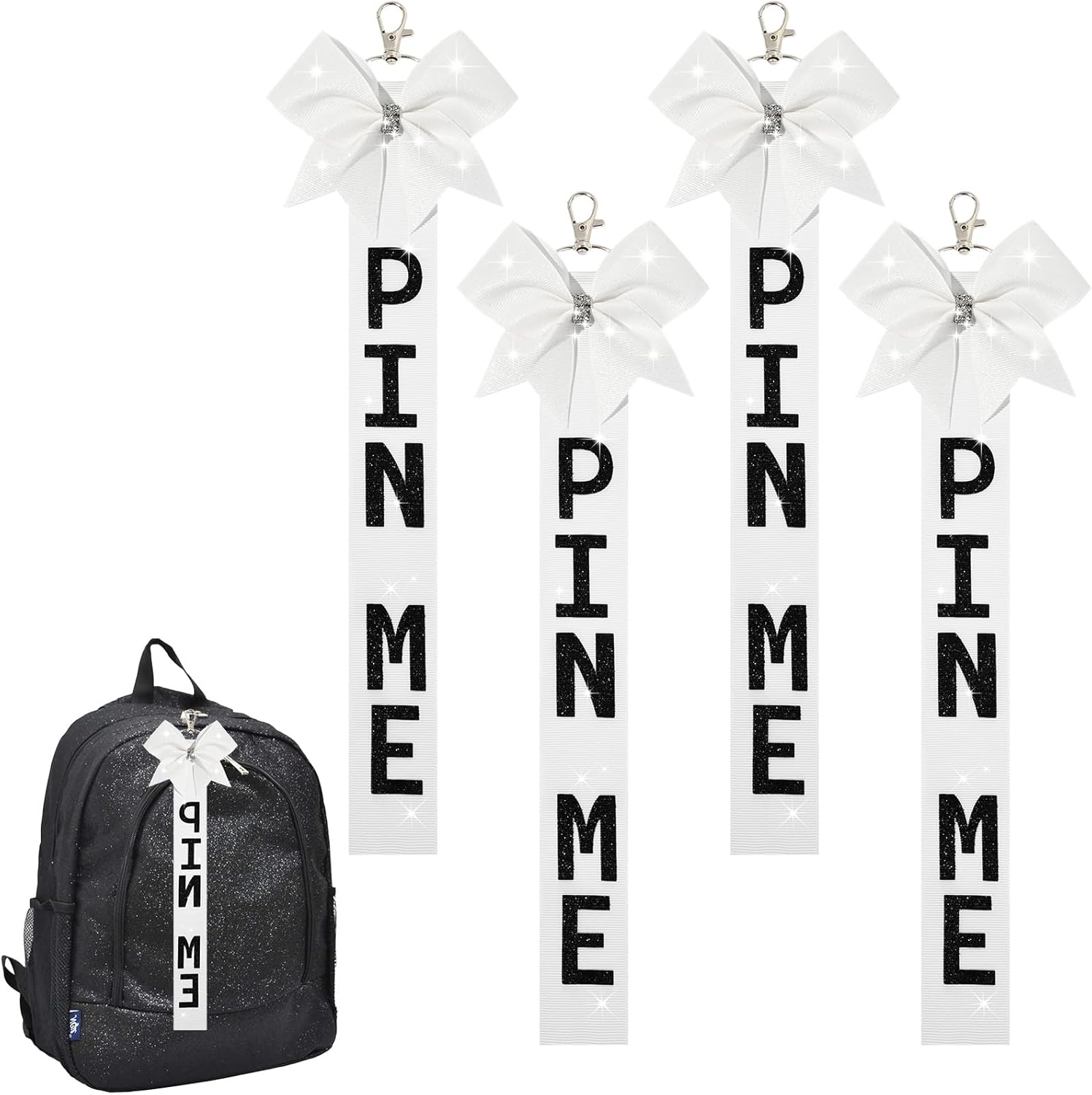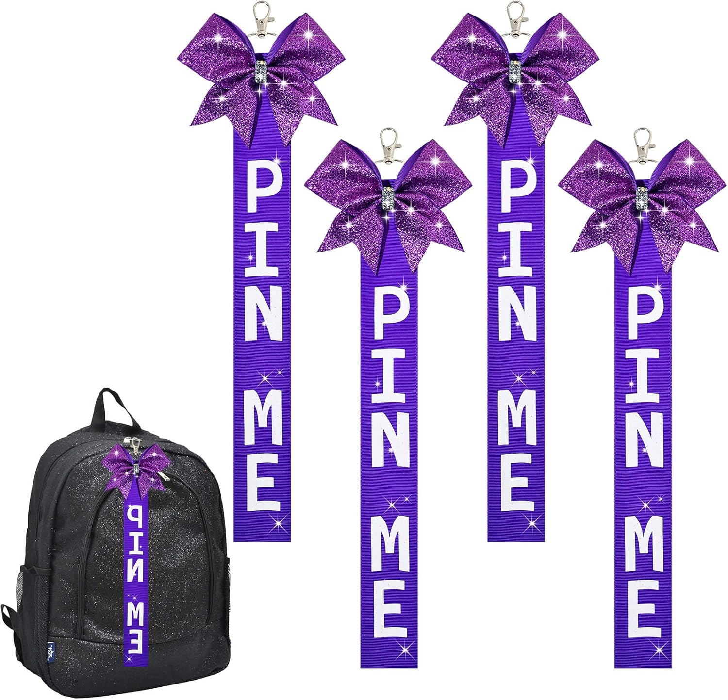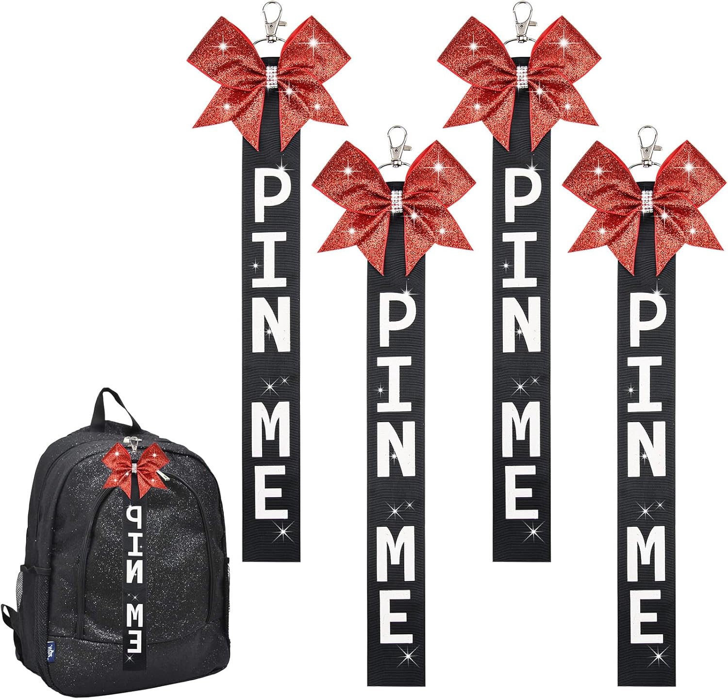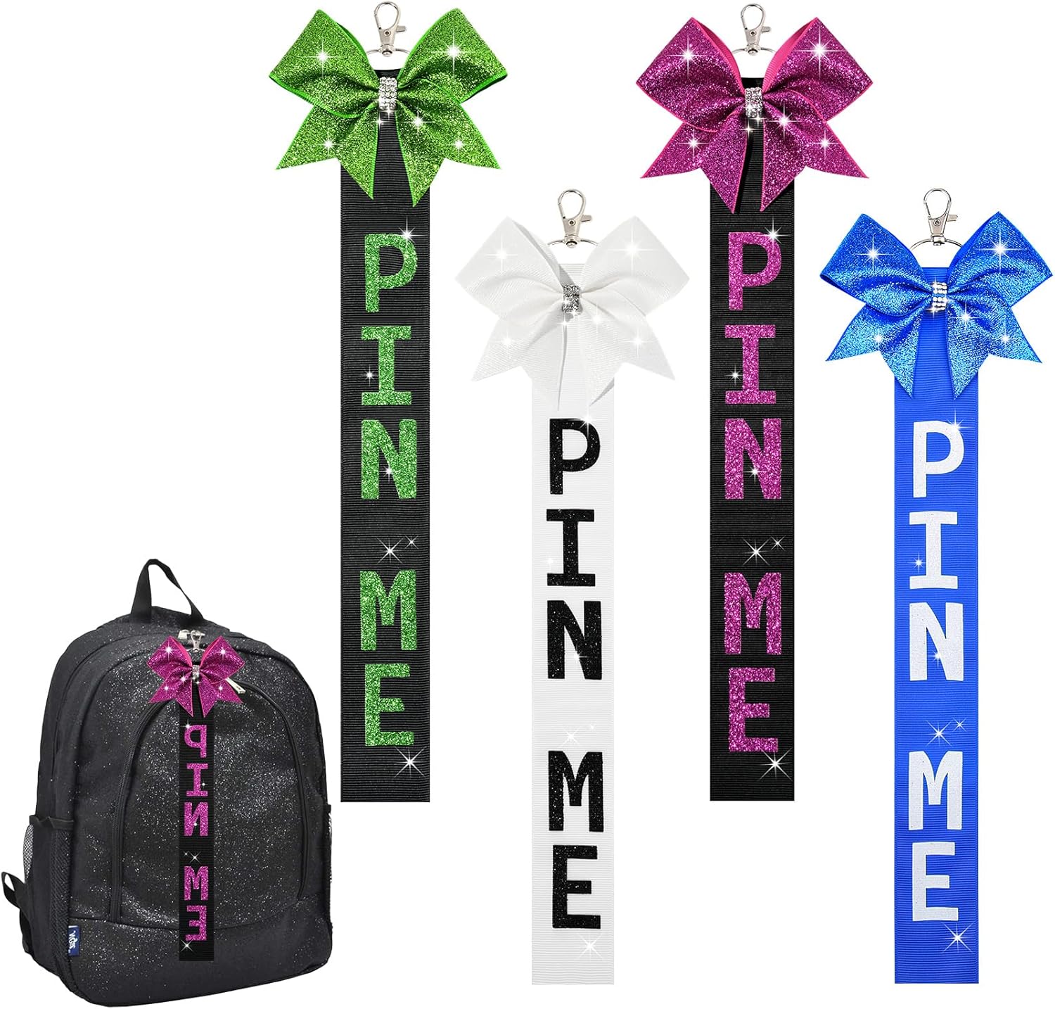 Cheer PIN ME Ribbon for Cheer Bags – Show off your cheer spirit with our 4 PCS set of "Pin Me" ribbon keychains. Each keychain is approximately 14 inches long, perfect for attaching to backpacks and collecting cheerleading pins. Adorned with glittering letters and a ribbon design, these keychains are the ideal accessory for any cheerleader.