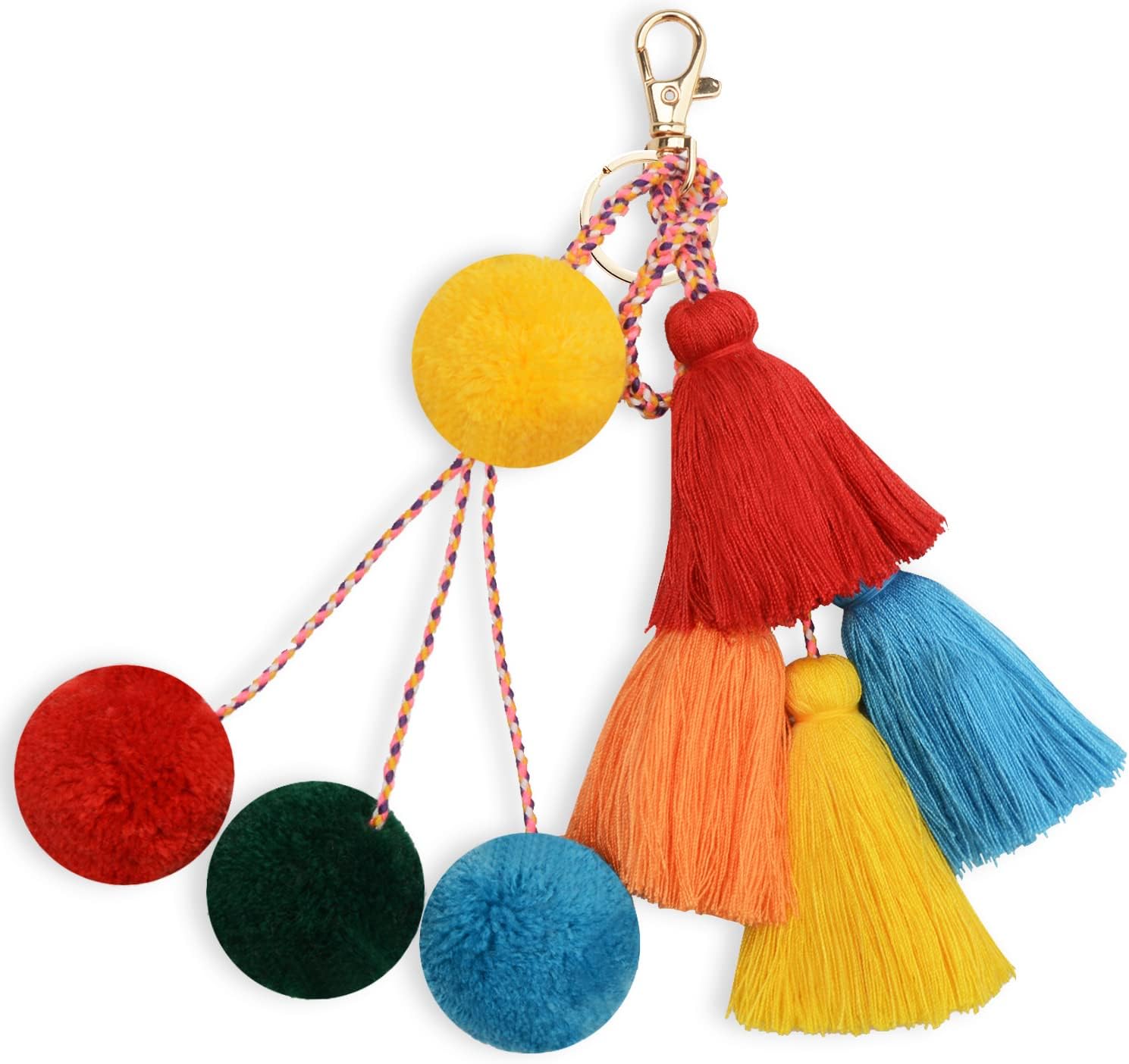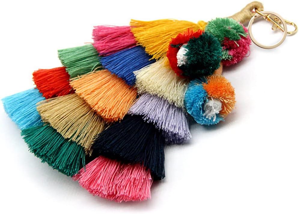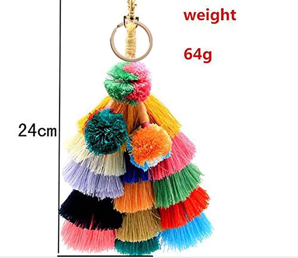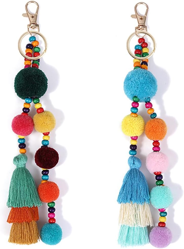 Colorful Keychains Boho Pom Pom Tassel Bag Decorations Charm Wristlet Bracelet Keyring for Women(A Style)