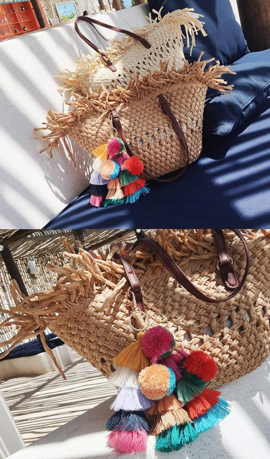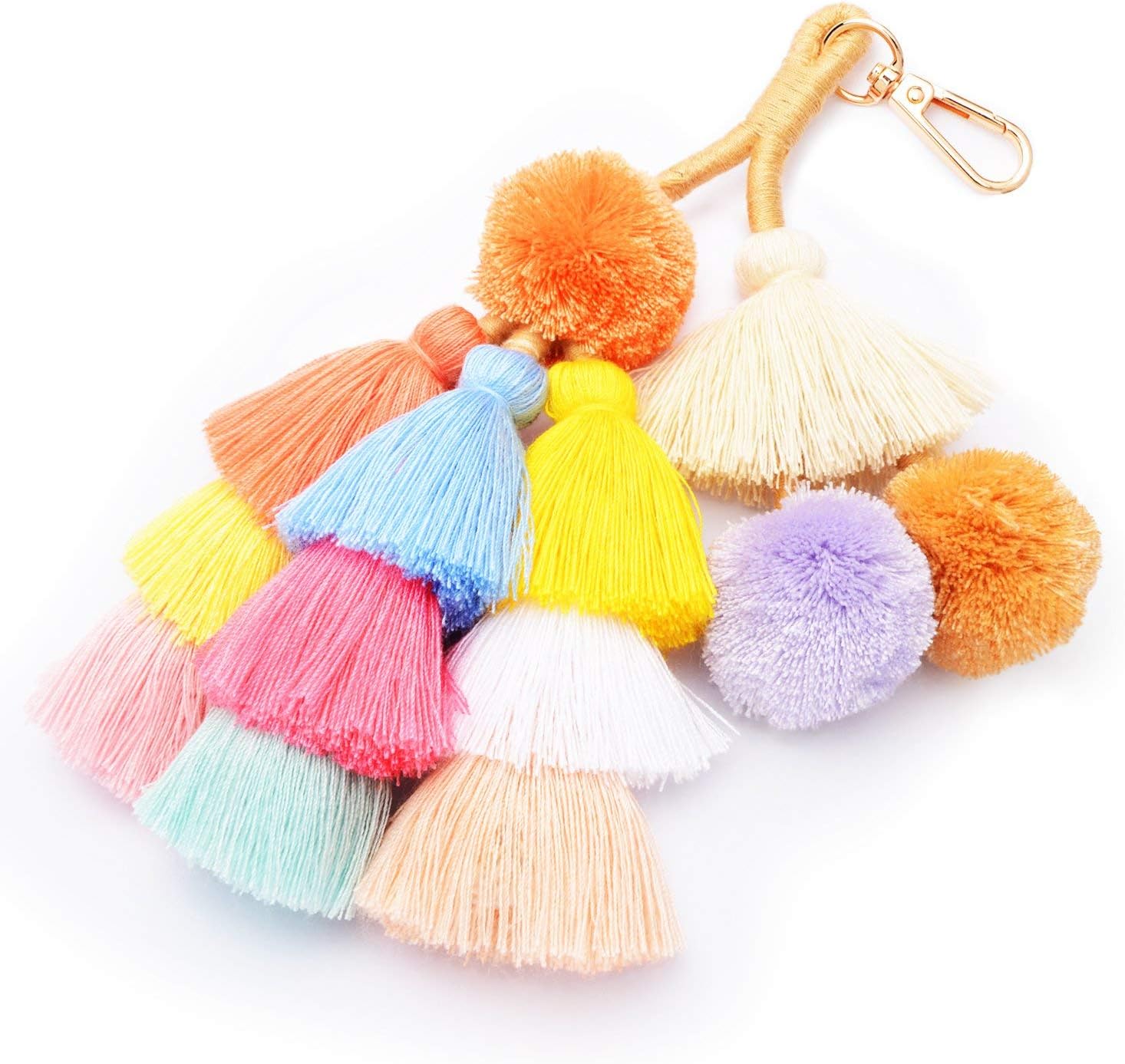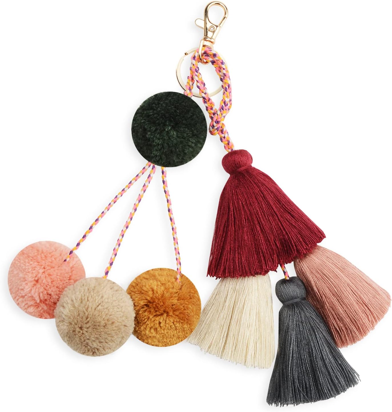 Colorful Keychains Boho Pom Pom Tassel Bag Decorations Charm Wristlet Bracelet Keyring for Women(A Style)