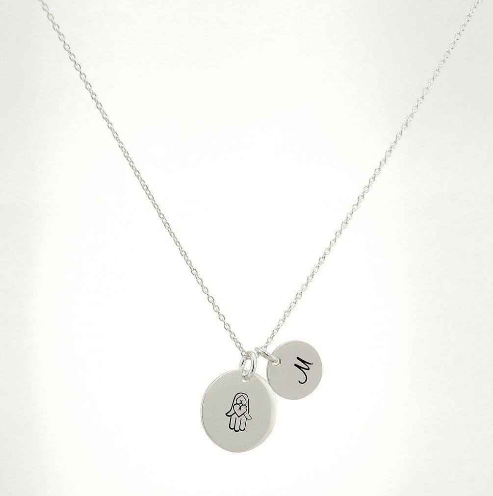 Denischarm Hamsa Hand Heart Hand Stamped Necklace Sterling Silver Custom Initial Letter Disc Personalized Pendant(18.0 Inches)