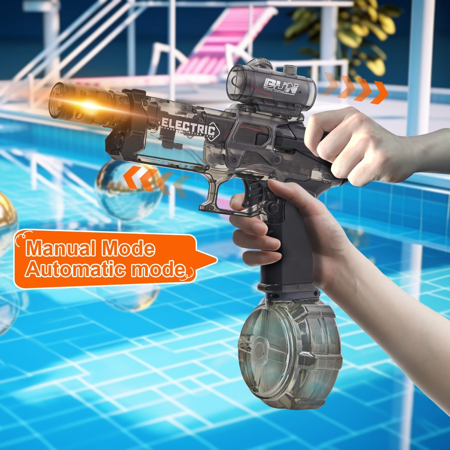 【2 modes】This electric water gun offers both manual and automatic shooting modes, designed to adapt to various play scenarios and preferences. Whether you’re aiming for precise manual shots or unleashing the power of automatic fire, this dual-mode feature ensures you have the perfect tool for every water fight. Its versatility suits both kids and adults, adding excitement to every play style.