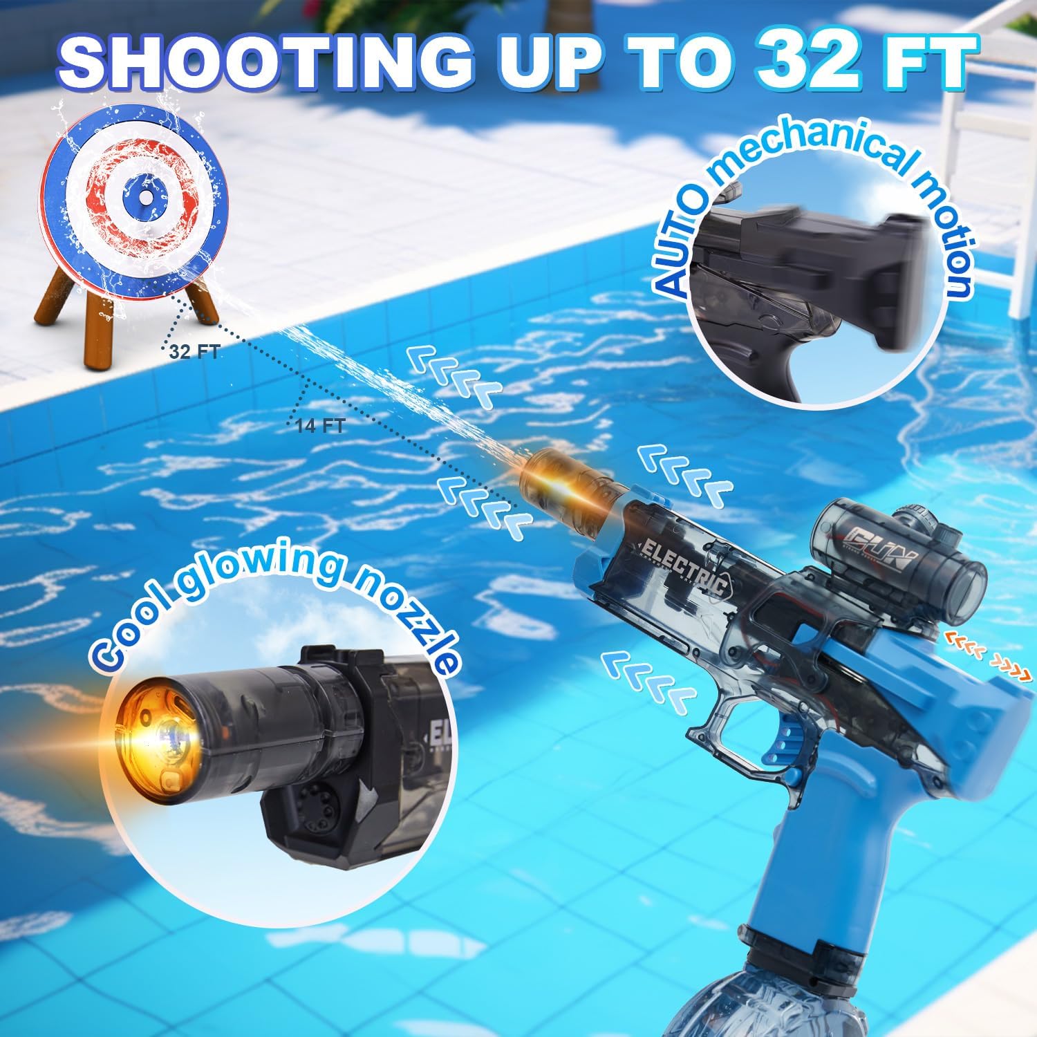 【32-FT Shooting Range】Equipped with advanced electronic pressure technology, this water gun shoots water up to an impressive 32 feet. The extended range gives you a tactical advantage, allowing you to hit opponents from a distance. Perfect for poolside fun, open spaces, backyards, and beach battles.