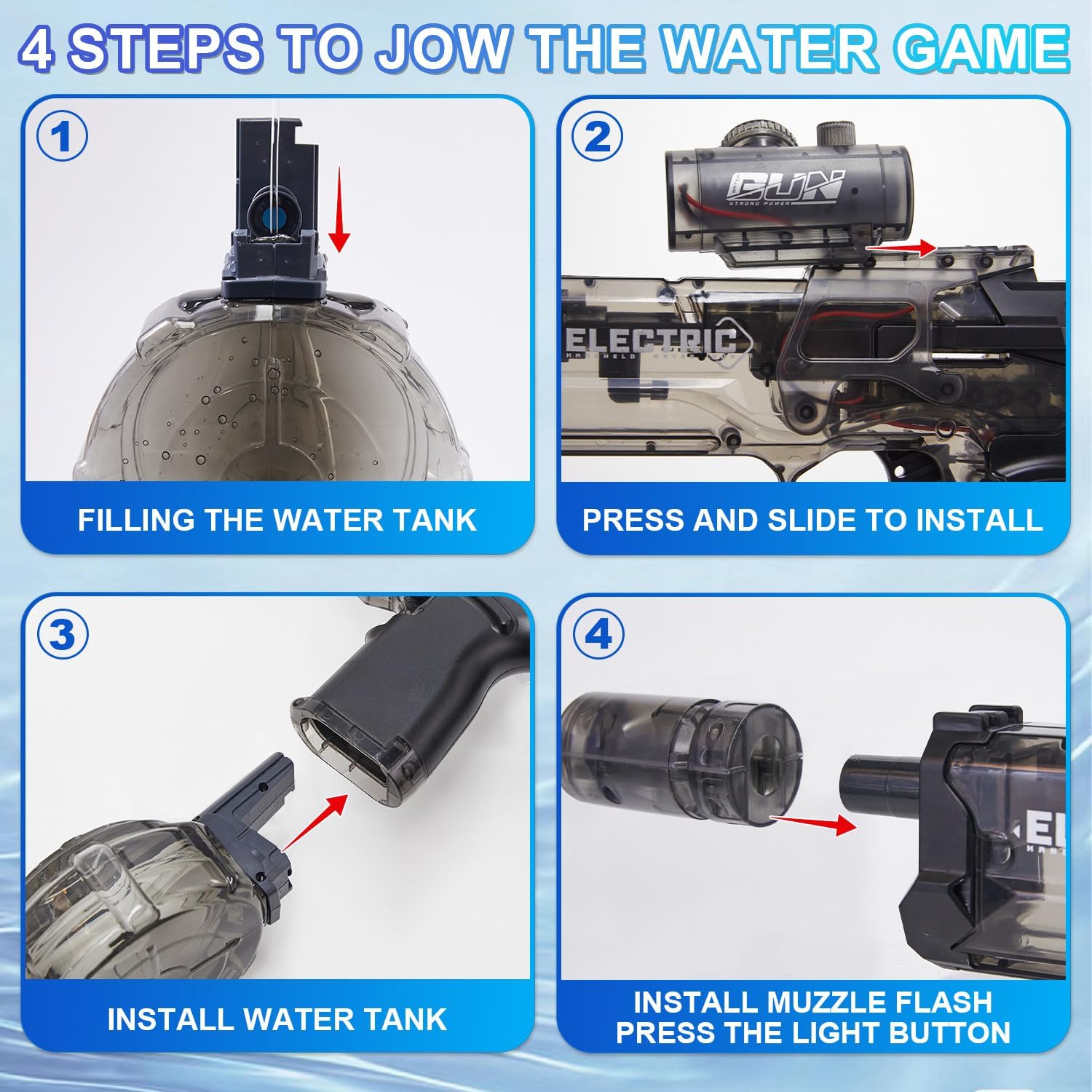 【4-Step Easy Assembly】Get ready to play faster. Forget complicated instructions! This water gun is designed for simple assembly in just four steps. Whether attaching the water tank, inserting the battery, or setting up the LED muzzle, you can start your game in minutes.
