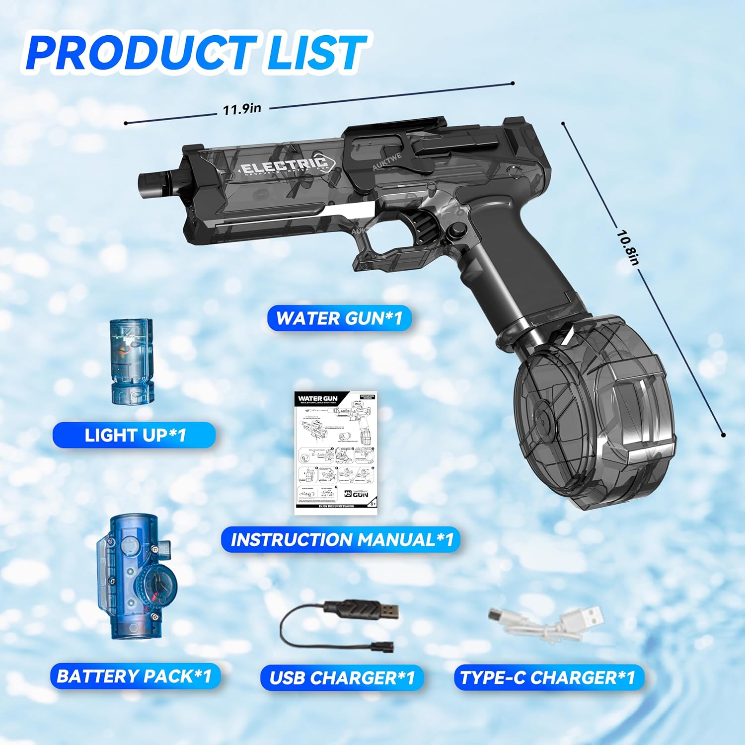 Cool Light-Up: This electric water gun features a unique light-up design, making every shot shine brightly. It adds extra fun and excitement to battles, making it a favorite for kids both day and night.