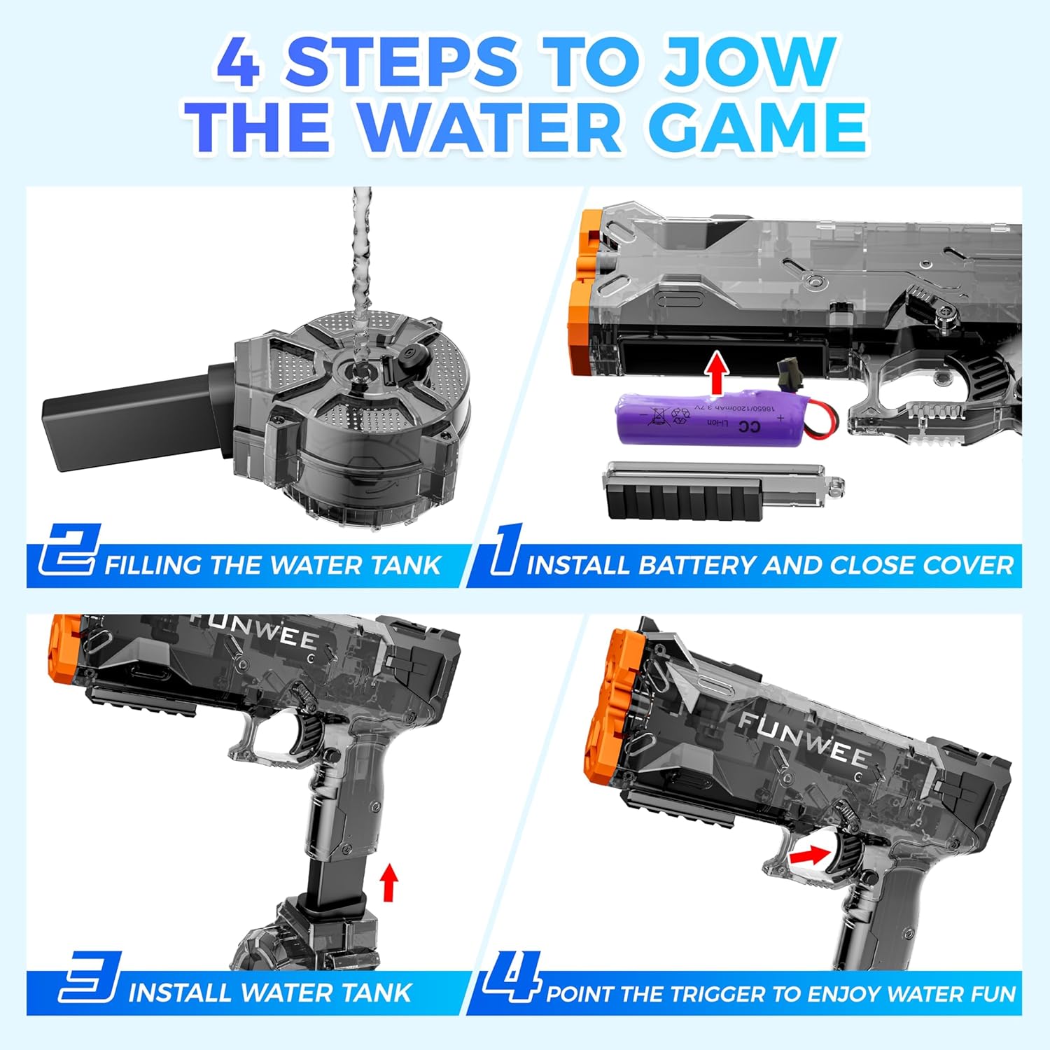 【Important Tips】User should strict accordance with instruction manual while operate the fully automatic water gun. Do not target at anyone's face or eyes. Any issue and question, please let us know, our team is here for you 24/7.