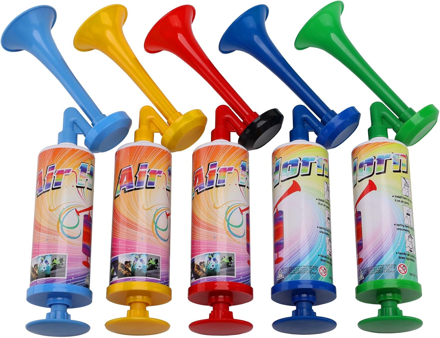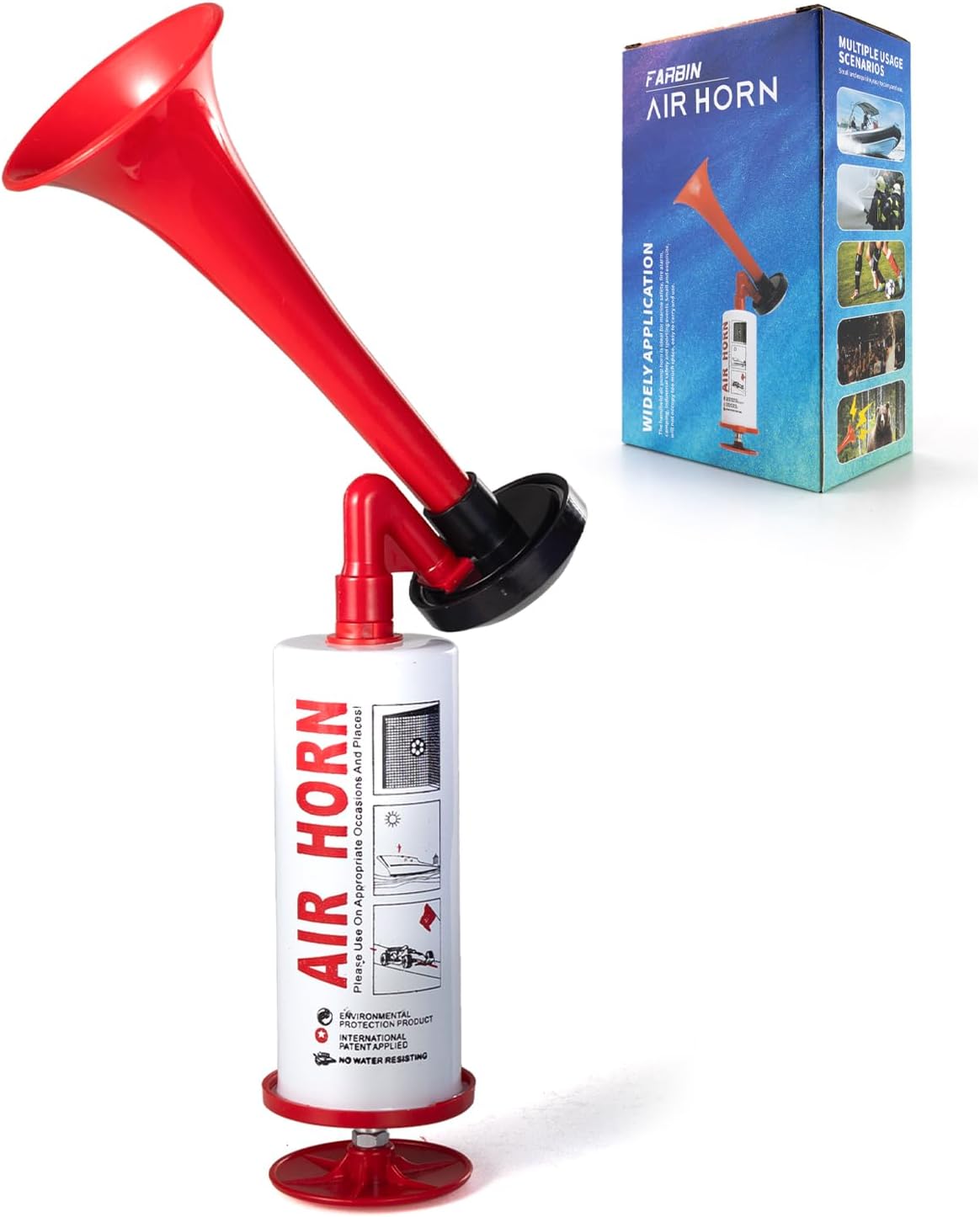1. Handheld air horn, small size, easy for children to grasp. Easy to carry and use. Push the handle to create the loud noise. Environmentally friendly, chemical free, no harmful gases, never runs out, no refills required. Always ready to go and durable. Easy to assemble pieces, take Trumpet screws onto pump.