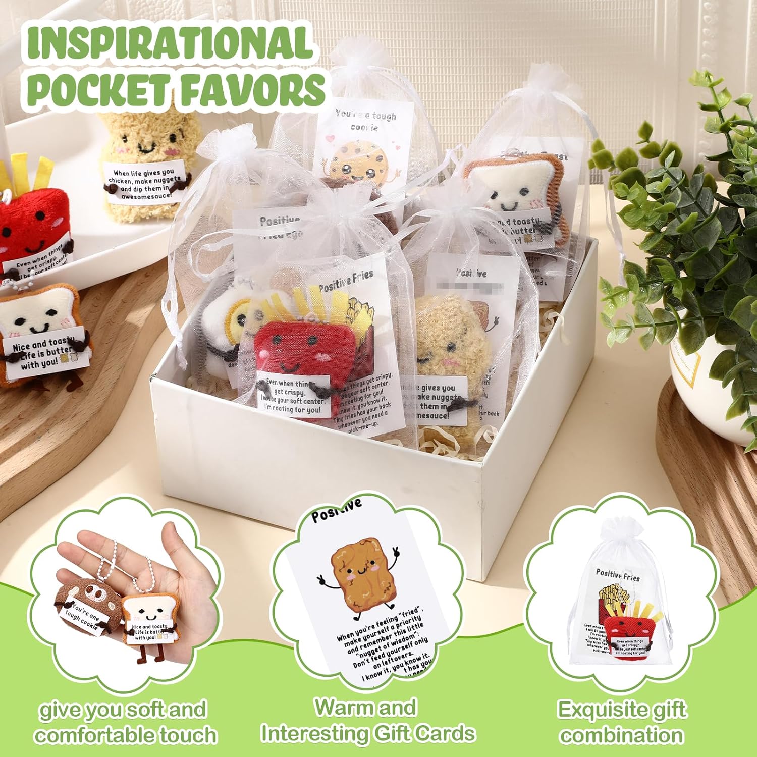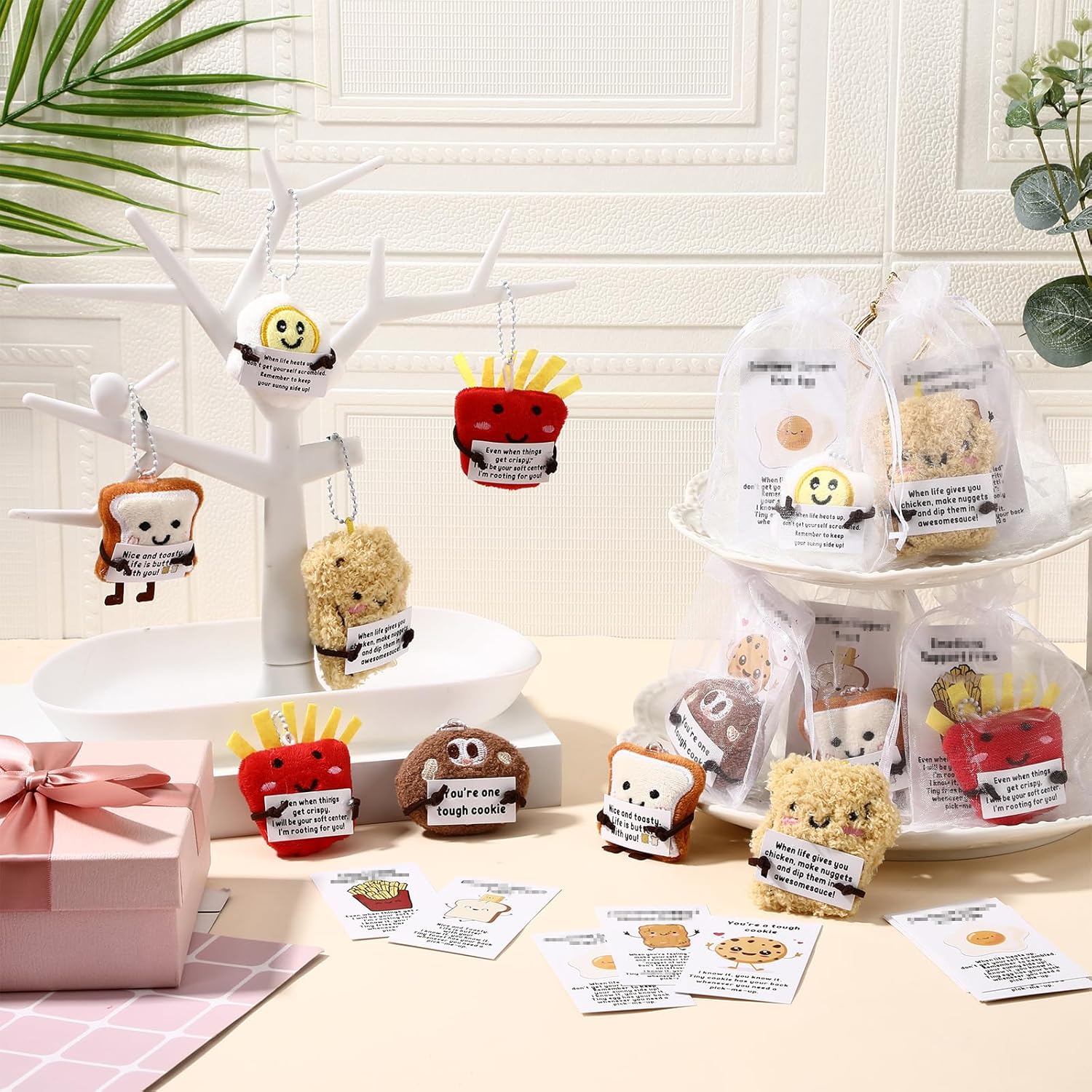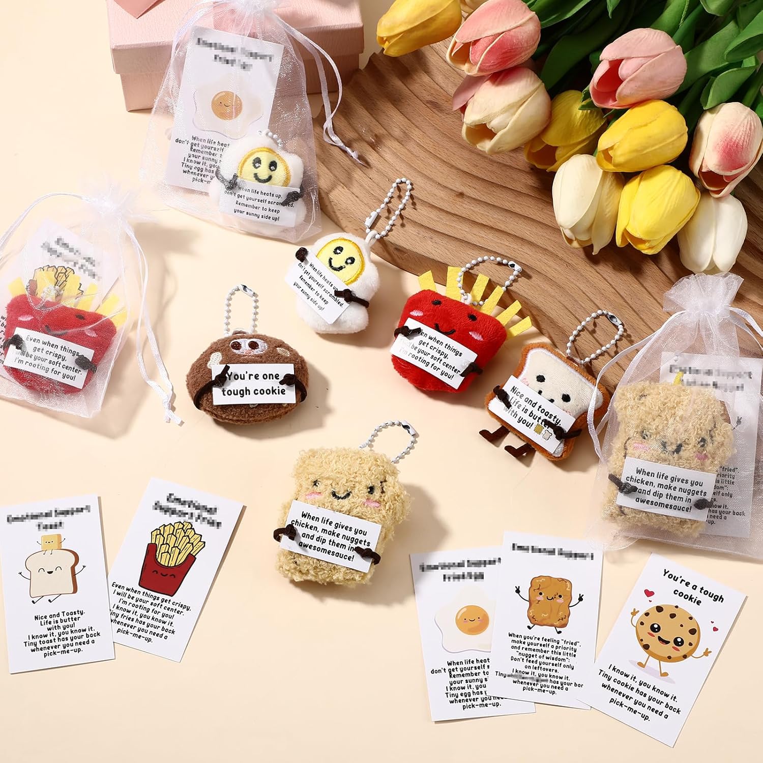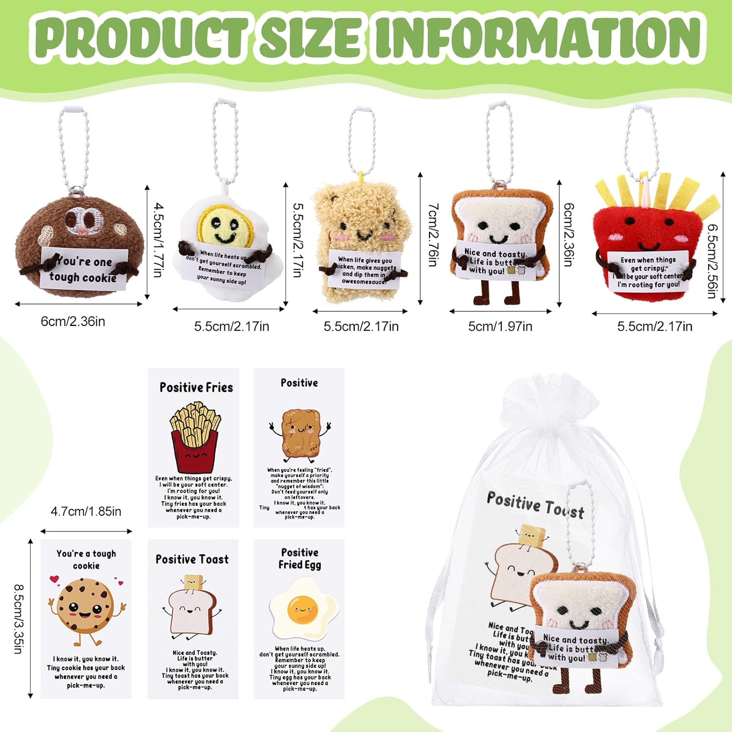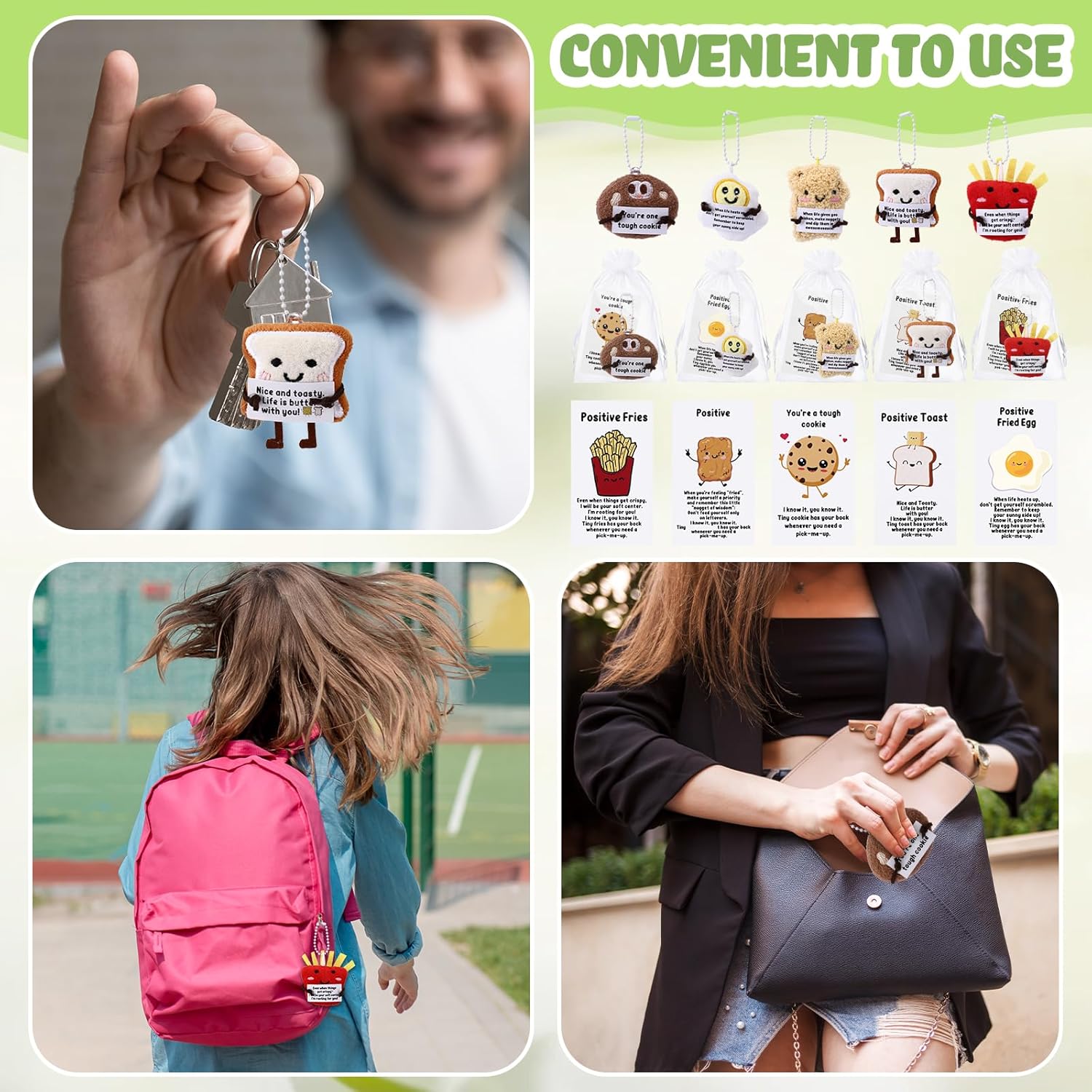 Positive Gifts in Bulk: you will get 10 sets of inspirational food keychain, including 5 kinds of mini food, including Toast, cookies, nuggets, eggs, French fries, a total of 10 sets; At the same time, this set comes with 10 corresponding cards, and 10 white organza bags, sufficient quantity, diverse styles, can be shared with family, friends, classmates, colleagues or employees, to meet your needs of large quantities