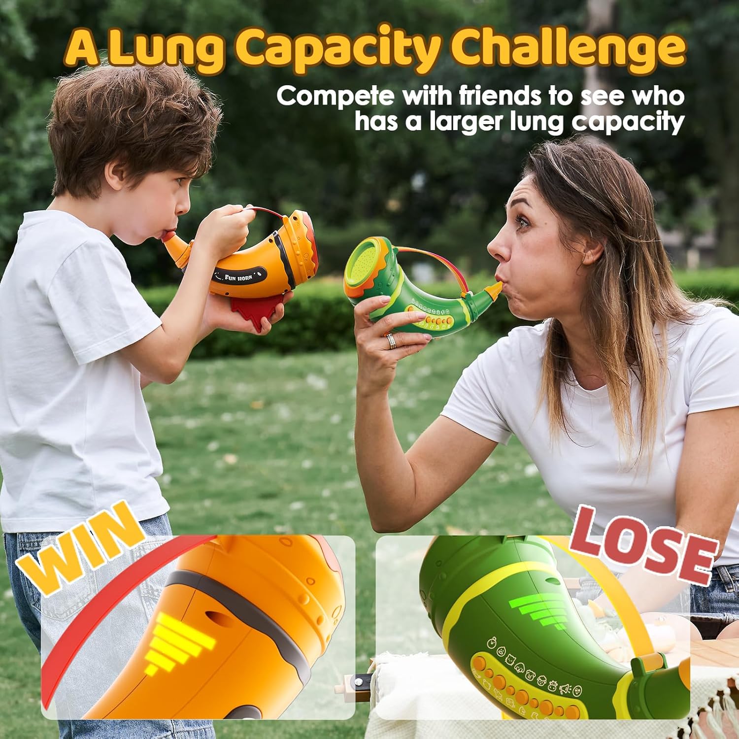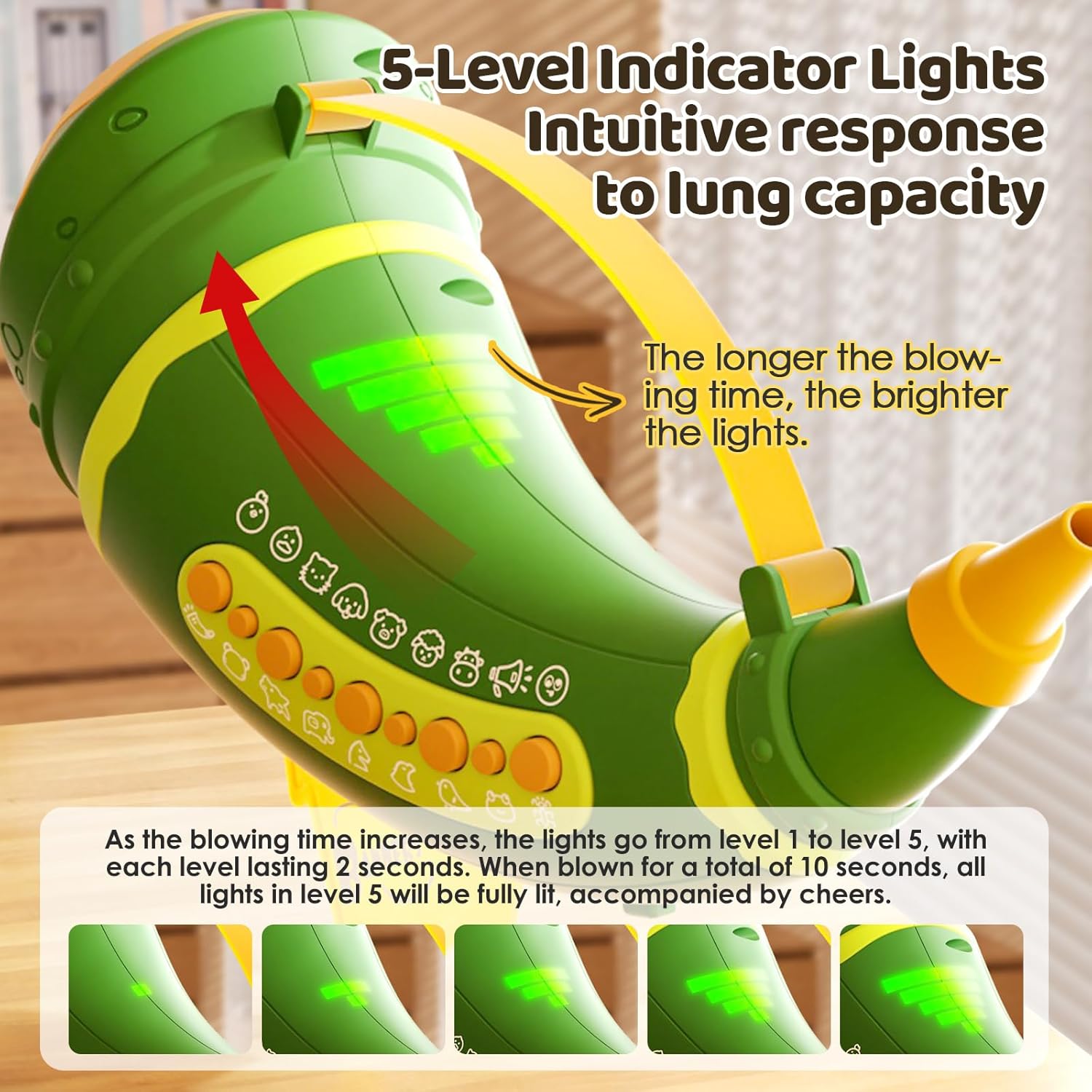 Lung capacity and 5-level lights: This Animal Caller helps improve lung capacity. It has a 5-level light system to monitor and enhance lung function. Blow into the horn and observe the lights to measure breath strength and track progress.