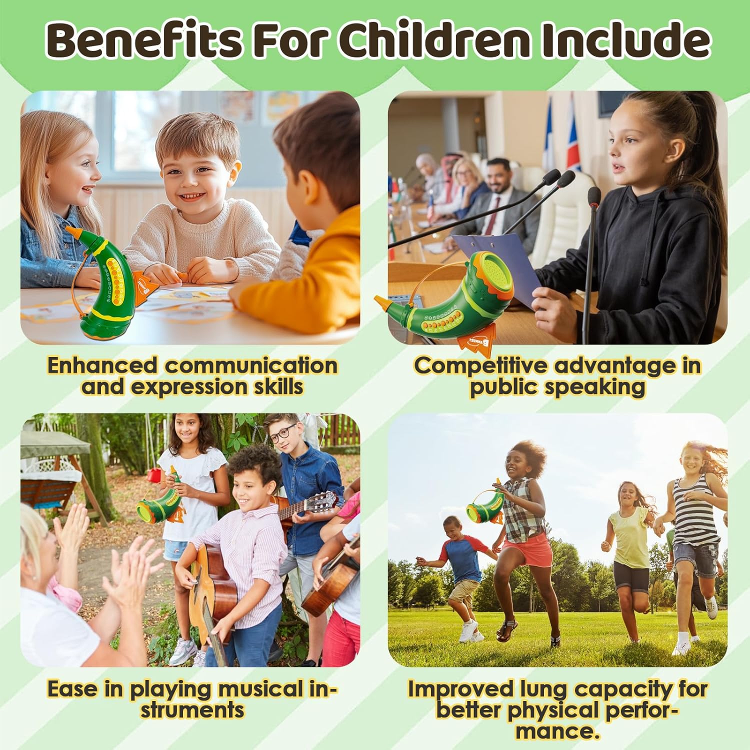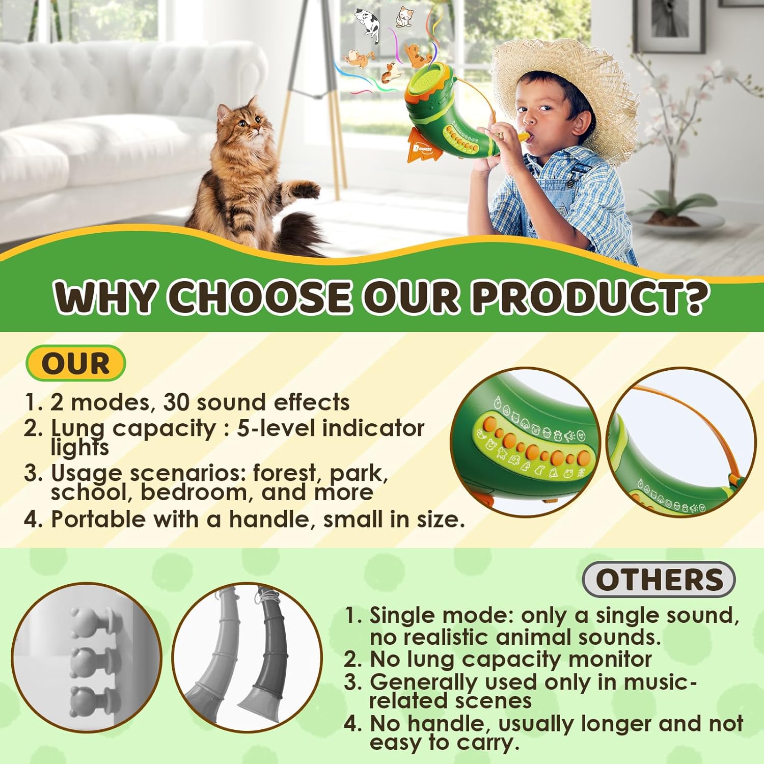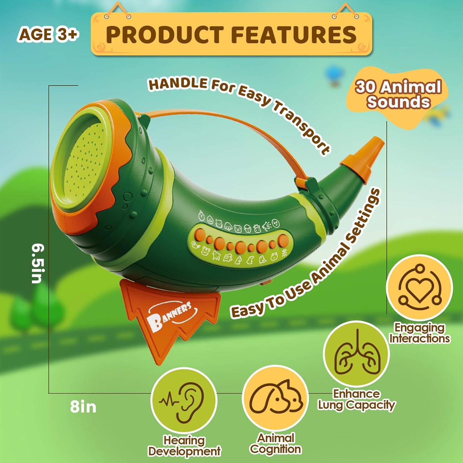 Comment on "Outdoor Discovery Animal Caller Toys for Kids Toddlers, Hunting Toys with 2 Modes & 30 Realistic Animal Sounds, Animal Toys with 8" Horn and 5-Level Lights, Early Learning for Boys Girls Ages 3+(Green)"