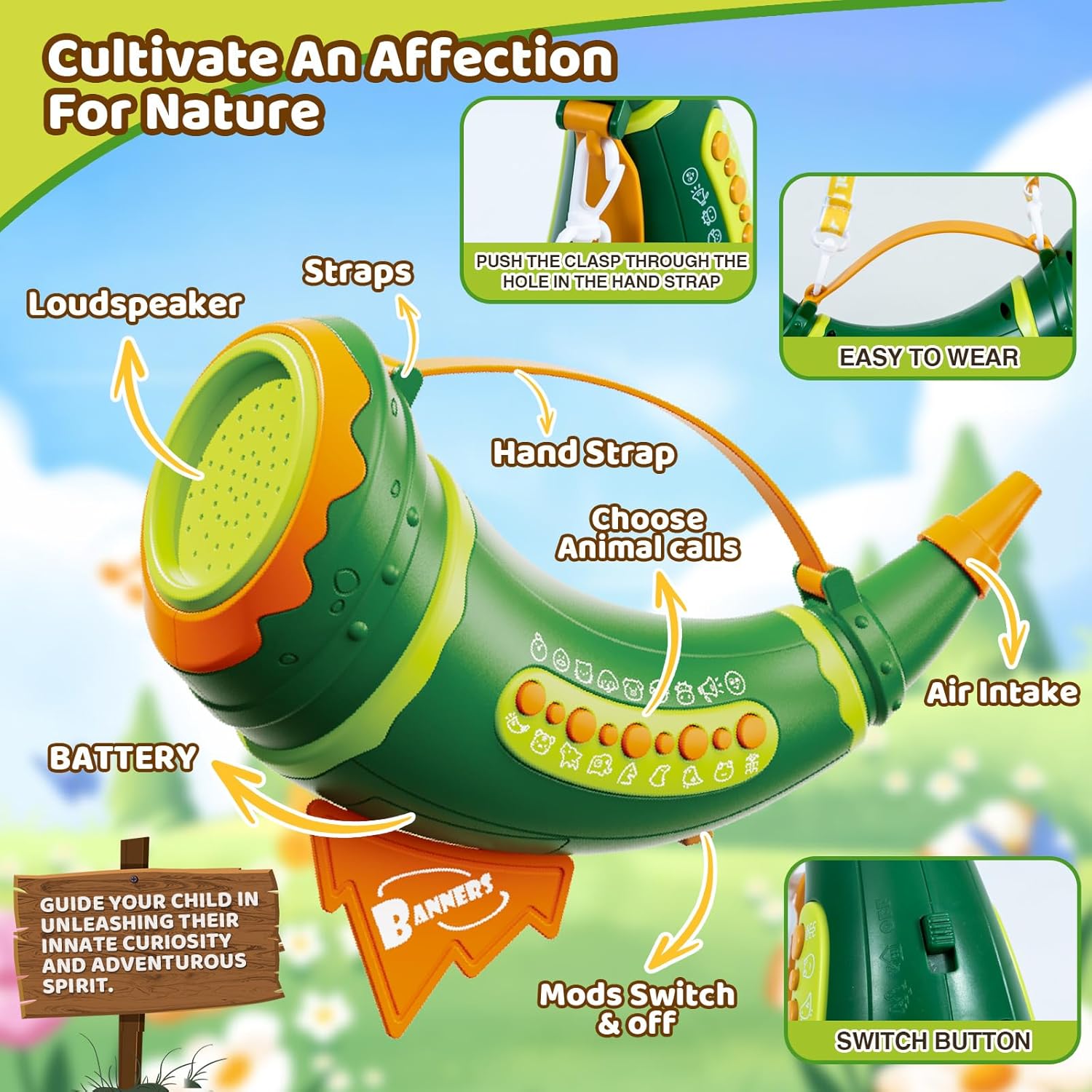 2 Modes and 30 Sound Effects: The Outdoor Discovery Animal Caller has 2 modes and offers 30 animal sounds. Simply blow into the 8" horn to switch between farm mode (chicken, duck, cat, etc.) and forest mode (tiger, wolf, elephant, etc.). Enjoy a lifelike wildlife experience at home.