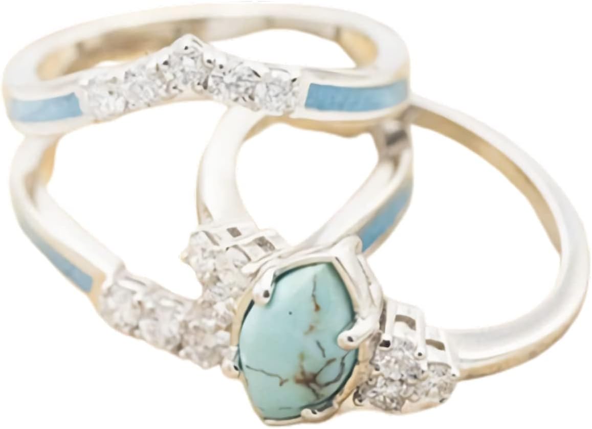 Pingyongchang 3 PCS Ring Set Natural Turquoise Diamond Rings Silver Color Rings for Women Jewelry Sparkling Natural Gemstone(11_)