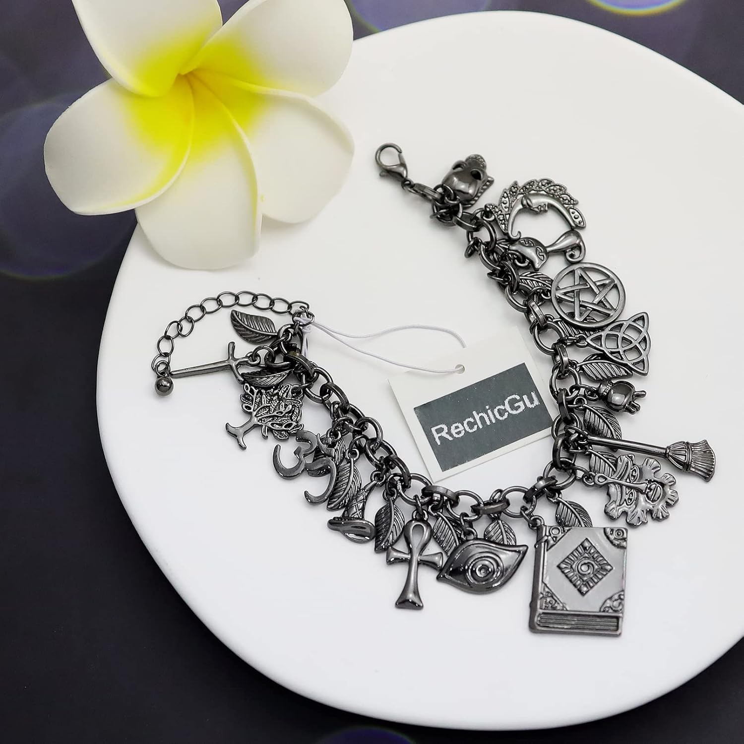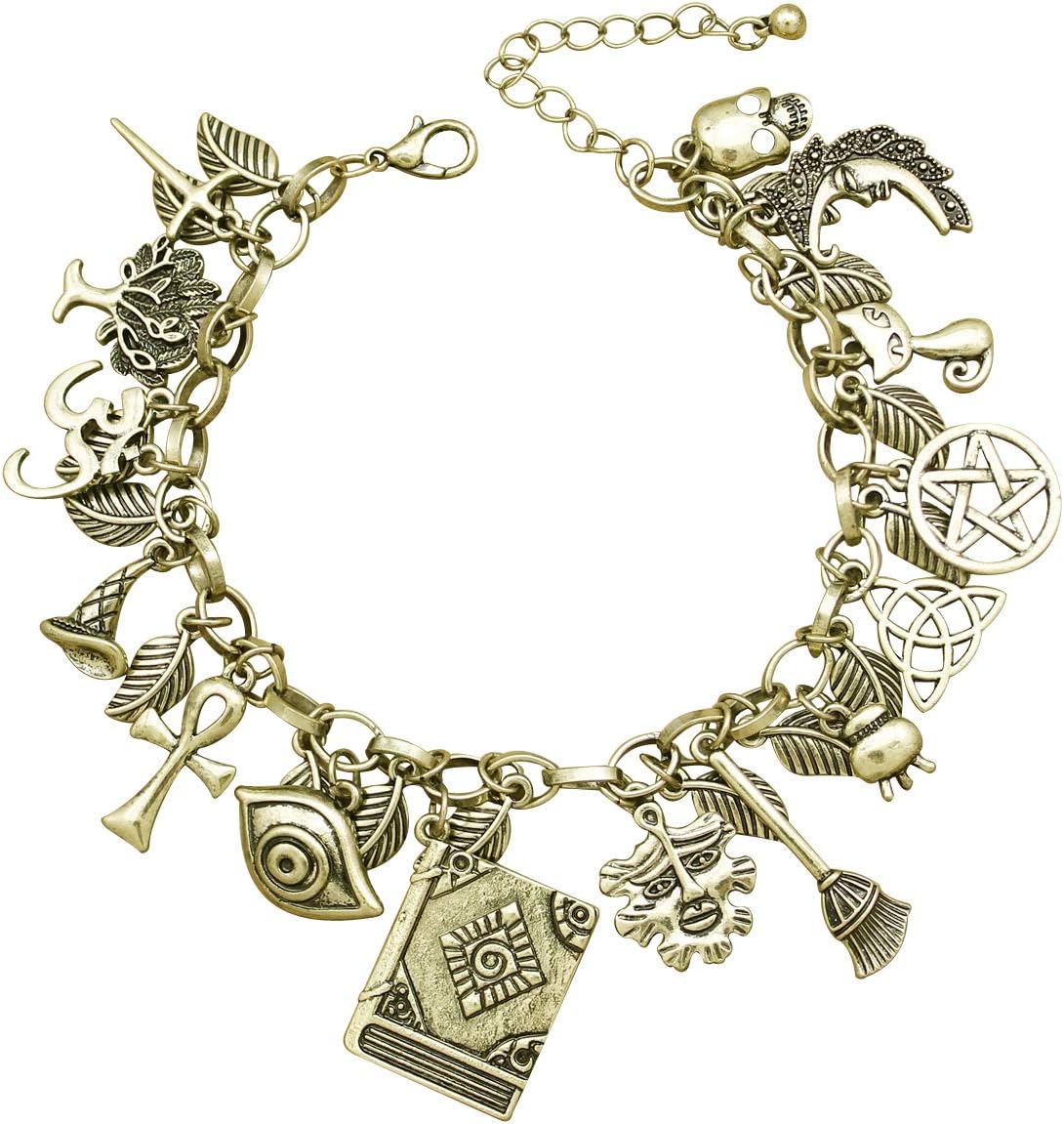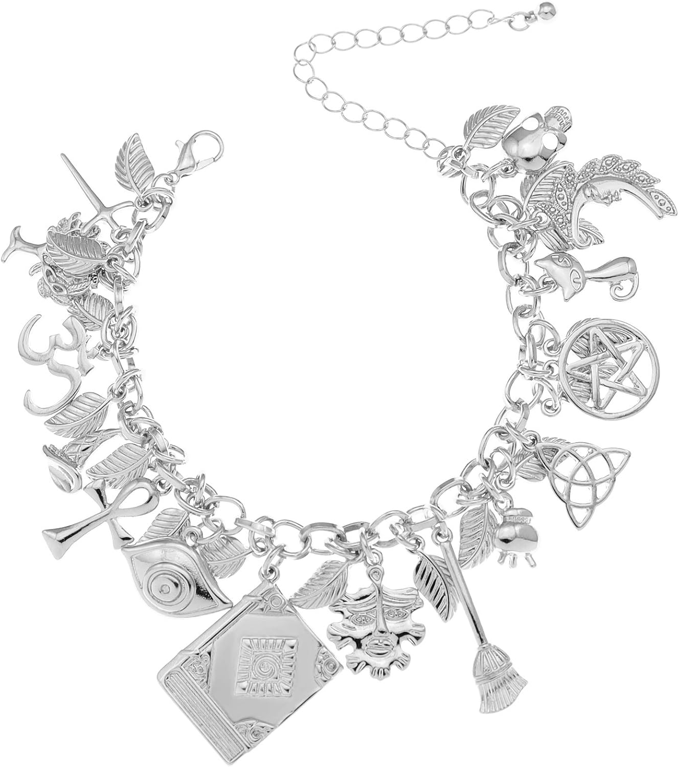 Fashion bracelet Styles: 1pc Bracelet with multi charms,including sword,Tree of life,Buddhist Om,Witch Sorting Hat,Ankh Cross,Evil Eye,the Bible,Green Man leaf face,Wizard broom,Celtic Trinity Endless Knot,Pentagram,Cat,Moon face,Skull.Trendy and Unique design makes it outstanding!It is the perfect addition to your coastal wardrobe. A great holiday gift she'll wear year around.