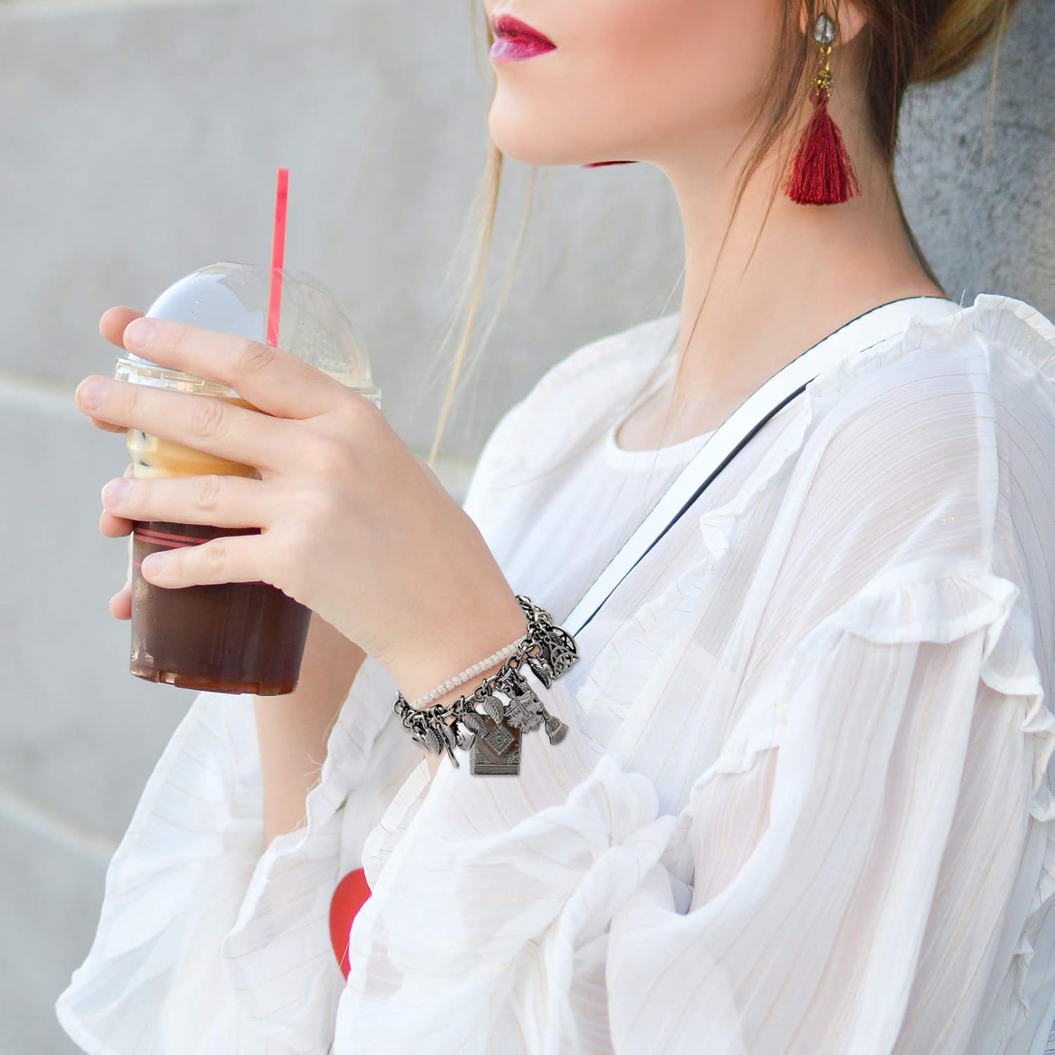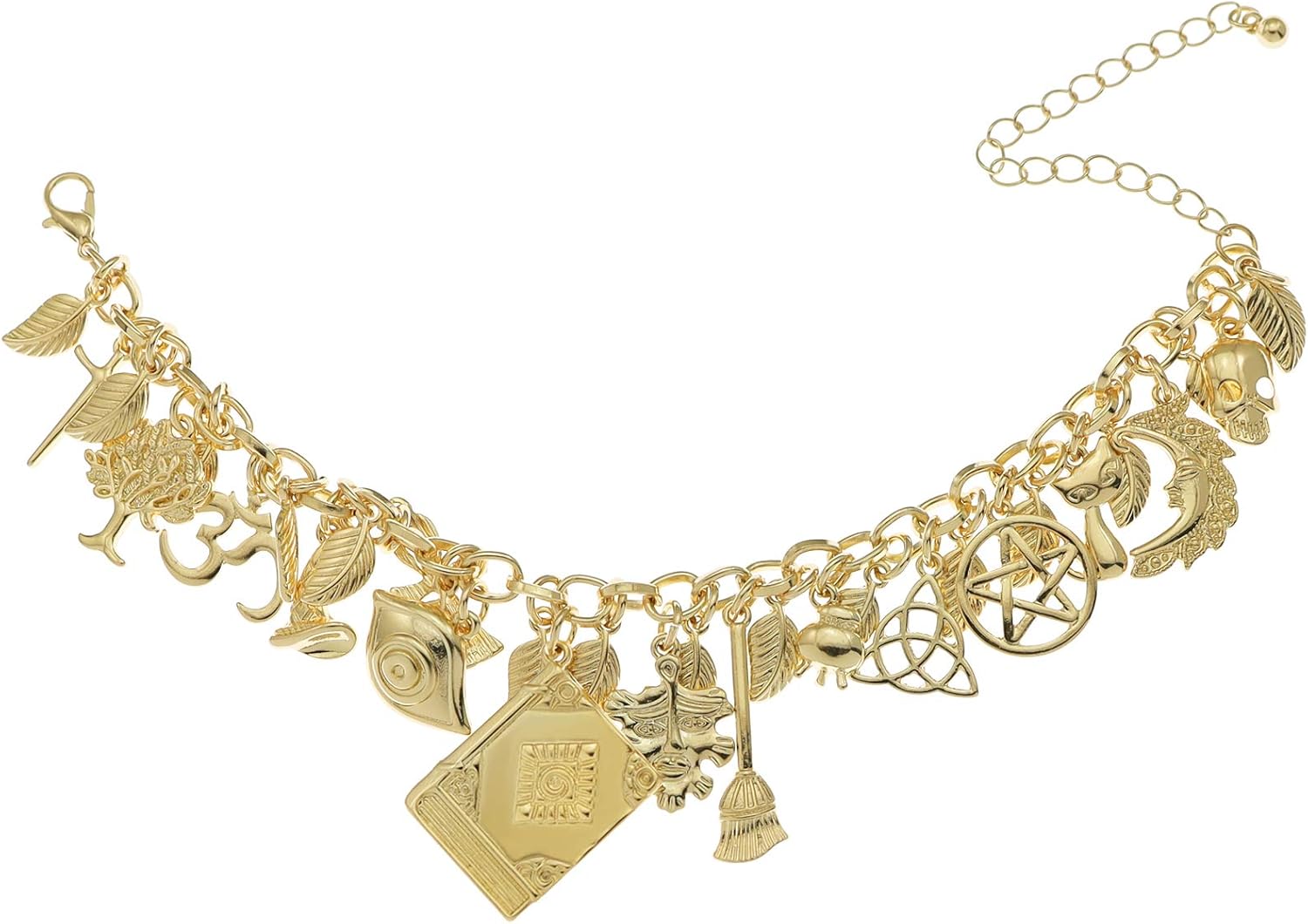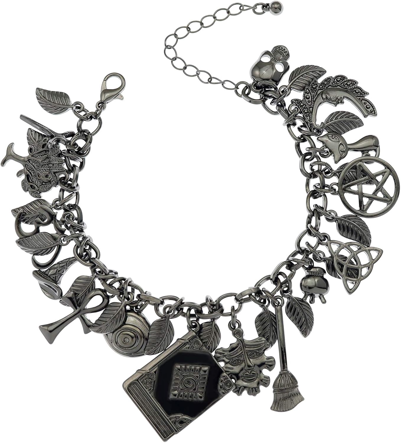 Fashion bracelet Styles: 1pc Bracelet with multi charms,including sword,Tree of life,Buddhist Om,Witch Sorting Hat,Ankh Cross,Evil Eye,the Bible,Green Man leaf face,Wizard broom,Celtic Trinity Endless Knot,Pentagram,Cat,Moon face,Skull.Trendy and Unique design makes it outstanding!It is the perfect addition to your coastal wardrobe. A great holiday gift she'll wear year around.
