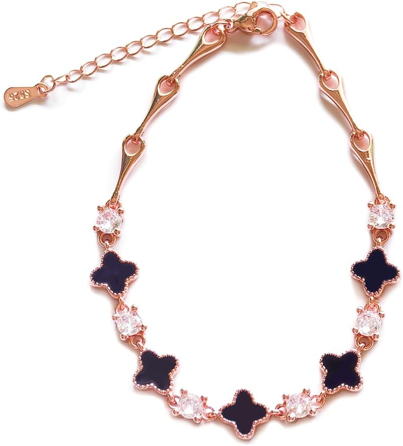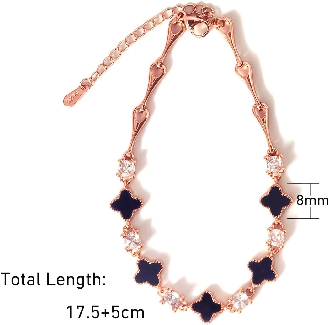 S925 Silver 14K Rose Gold plated Clover Lucky Bracelet for Women Green/Black/White/Red Flower Four Leaf Link Bracelets Trendy Jewelry Gifts for Women(Black-17.5cm+5cm)