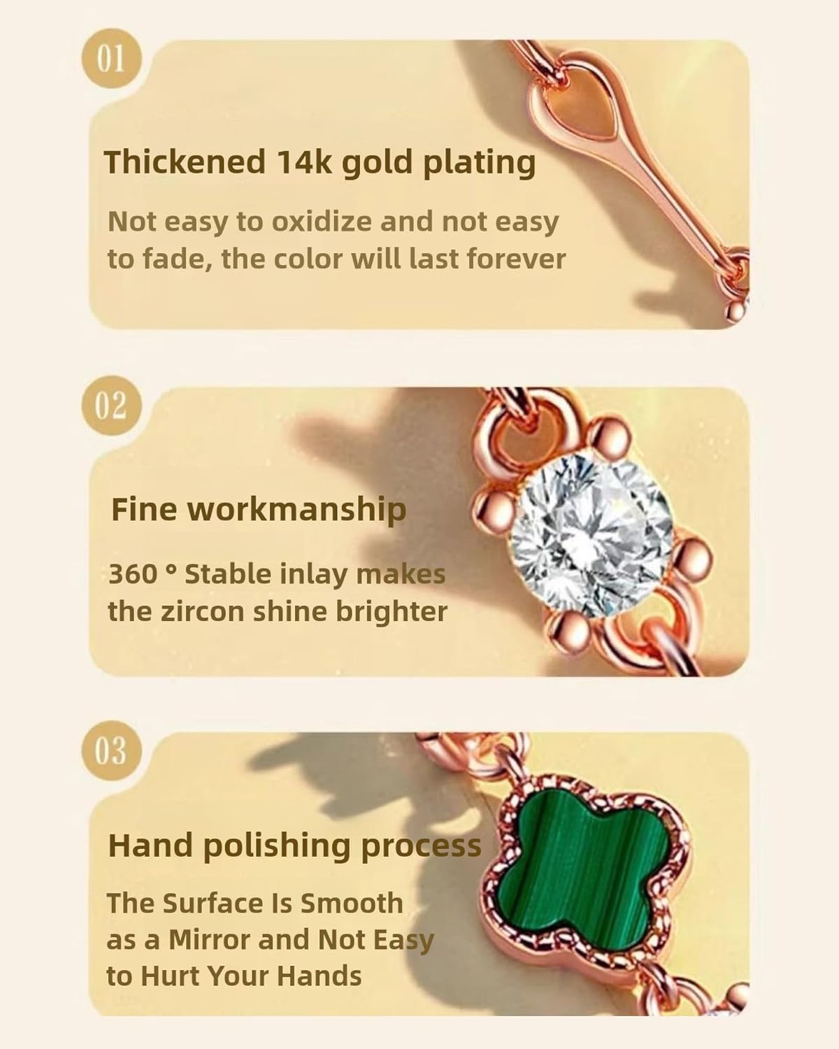 3Size: The length of the clover bracelet is 7.48 inches +1.96 inches of extension chain, adjustable extension chain design, fits the vast majority of people's wrists