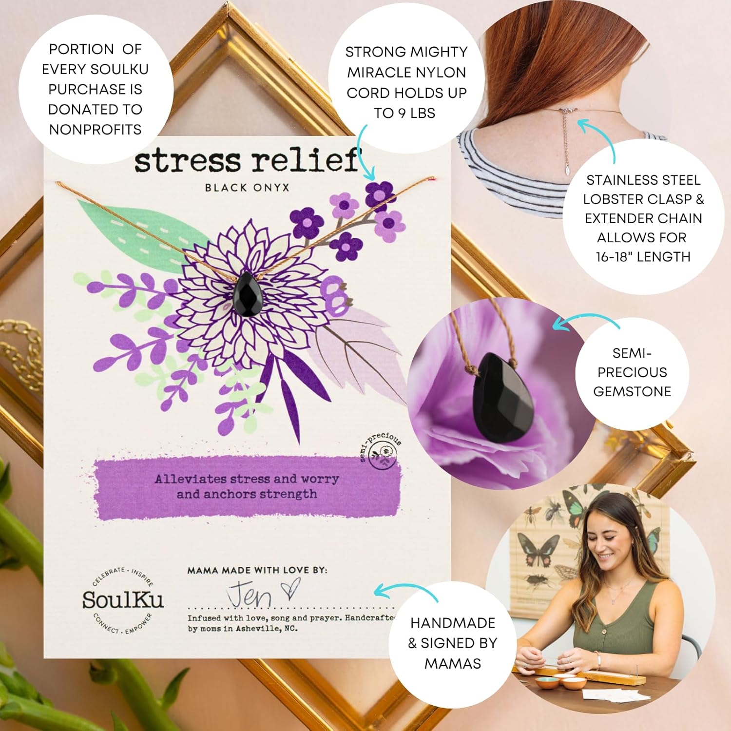 SoulKu Handcrafted Necklace, Empowerment Jewelry With Healing Crystal, Inspirational Jewelry For Women, Mom & Sister Gifts, 2" Extender With Lobster Clasp, 16" Nylon Cord(Black Onyx)