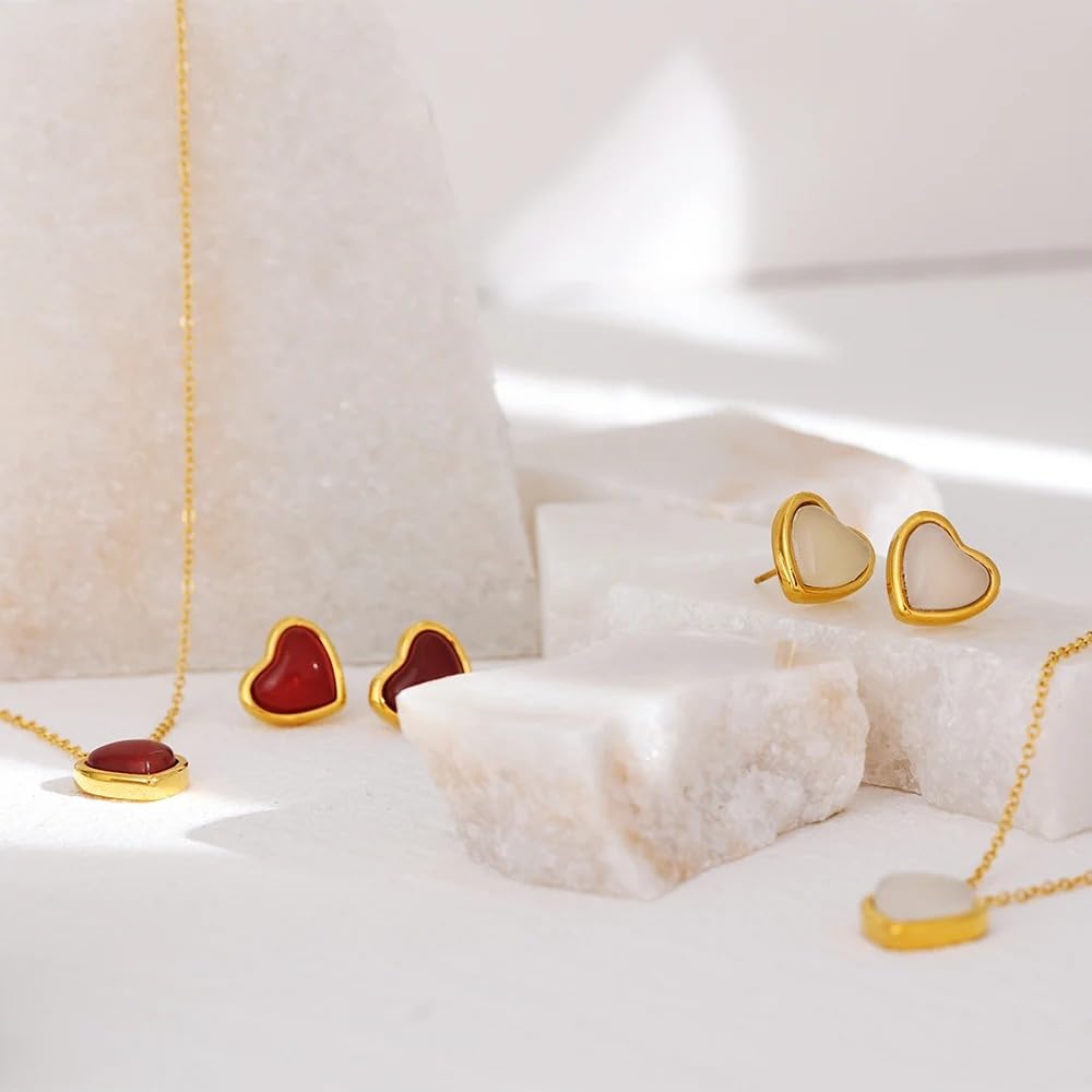 Stainless Steel Heart Pendant Necklace with Agate(16.53 + 2.36 inches) (Necklace White)(Necklace Red)