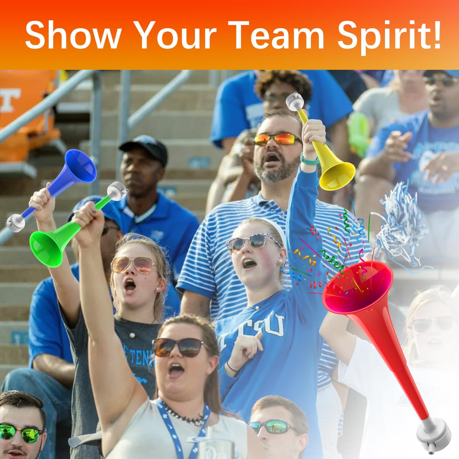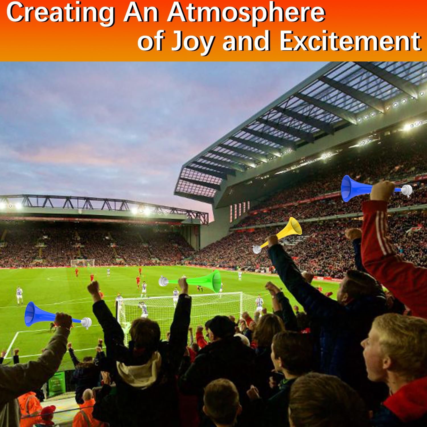LOUD HORNS: Our stadium horns deliver a powerful sound, reaching up to 120 decibels. They're perfect for party pranks, event ceremonies, sports games, and more! These horns create an exciting atmosphere, ensuring your friends and family cheer loudly for your favorite team.