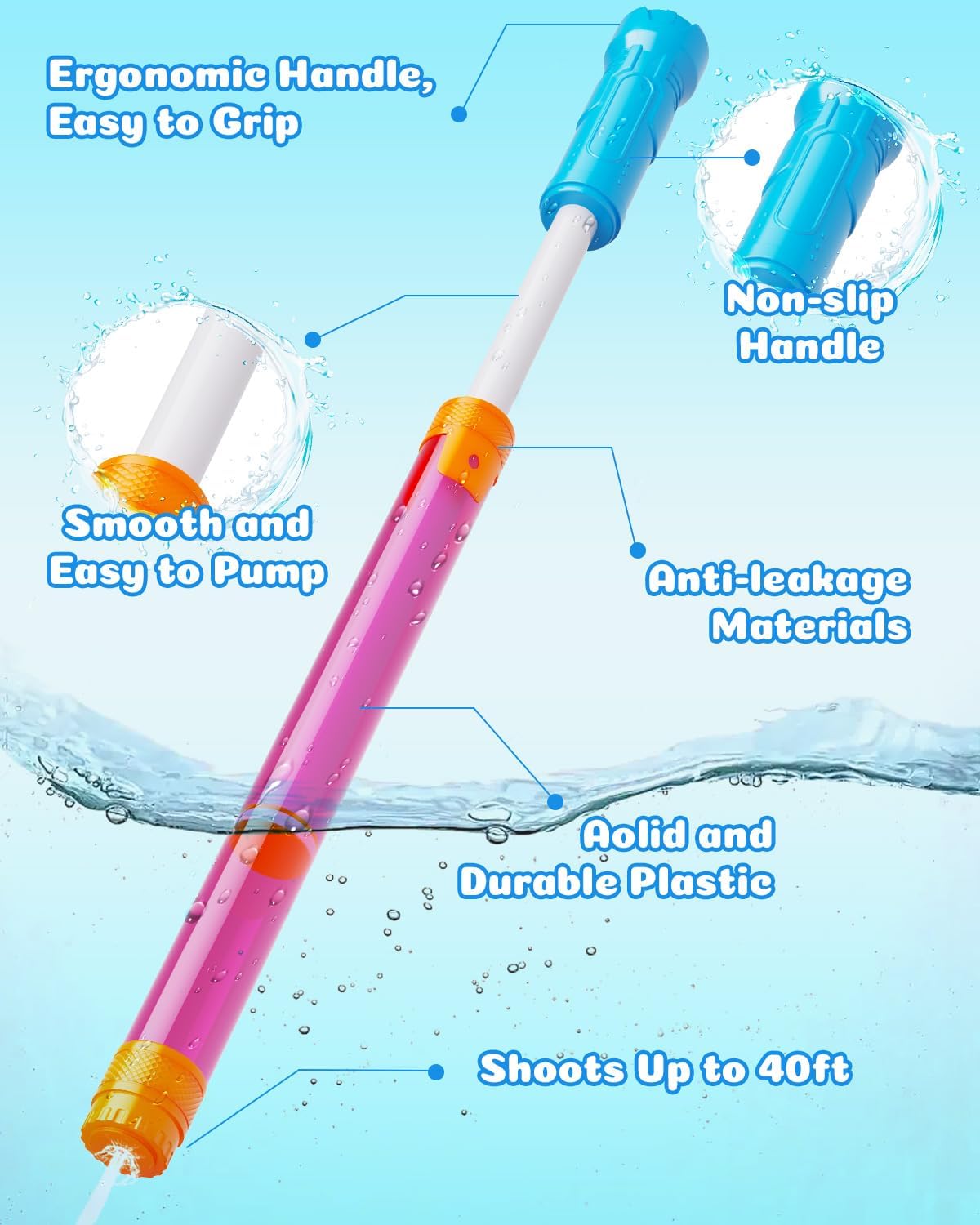 Lightweight, Easy to Use: Simply pump the water guns handle to fill the tank and start enjoying the fun of spraying water shots! Even 3 year olds can easily operate it and enjoy the fun of water battles! With lightweight design, the water blasters for kids is easy to carry to the beach, park, backyard, pool and other outdoor areas, fit for family gatherings, pool parties, beach for friendly competition. It is perfect for outdoor water toys and beach toys!