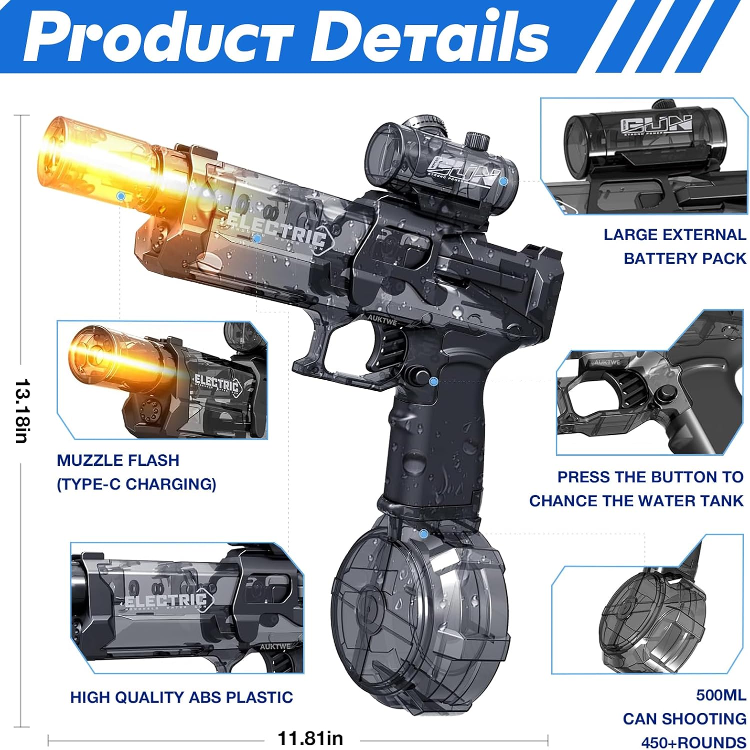 【Dual-Mode Combat Readiness】 Switch between precision manual shots and rapid auto-fire in this electric water gun. The 1200mAh battery fuels 45min+ continuous action (exact runtime varies by mode) - the smart choice for adult water gun enthusiasts.