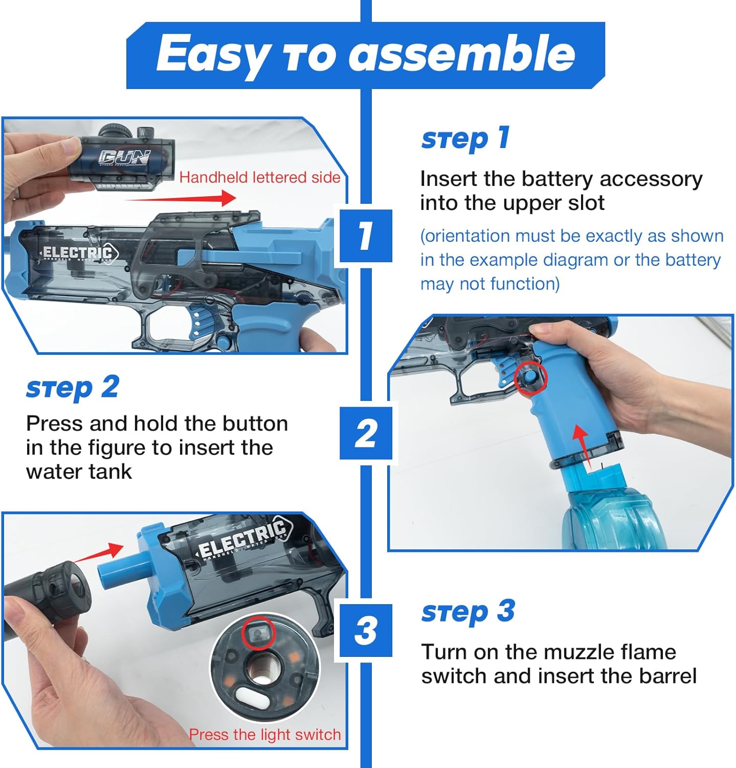 【Tactical LED Battle Effects】 Dominate night fights with dazzling muzzle flashes! This electric water gun for adults features synchronized LED bursts that illuminate every 26ft shot, creating immersive summer toys warfare. Perfect for backyard battles or beach showdowns after dark.